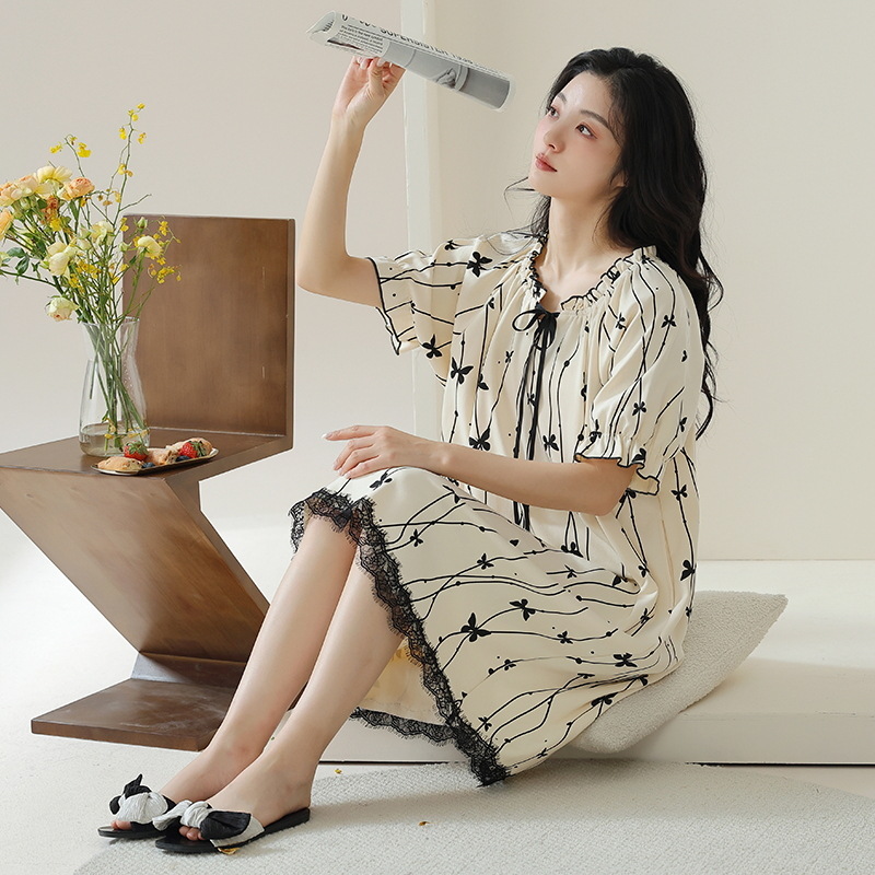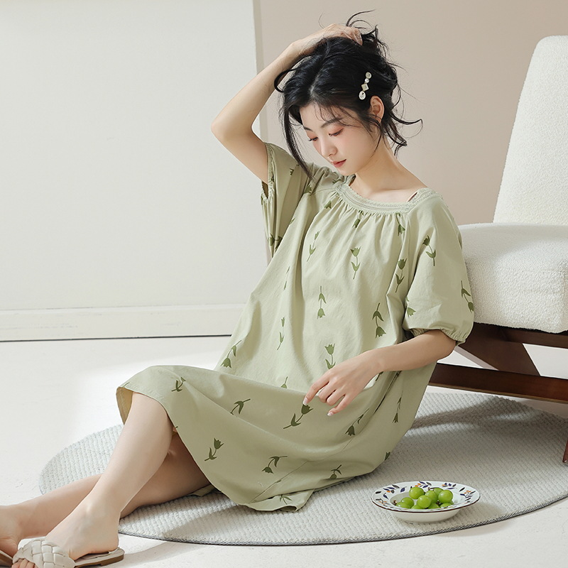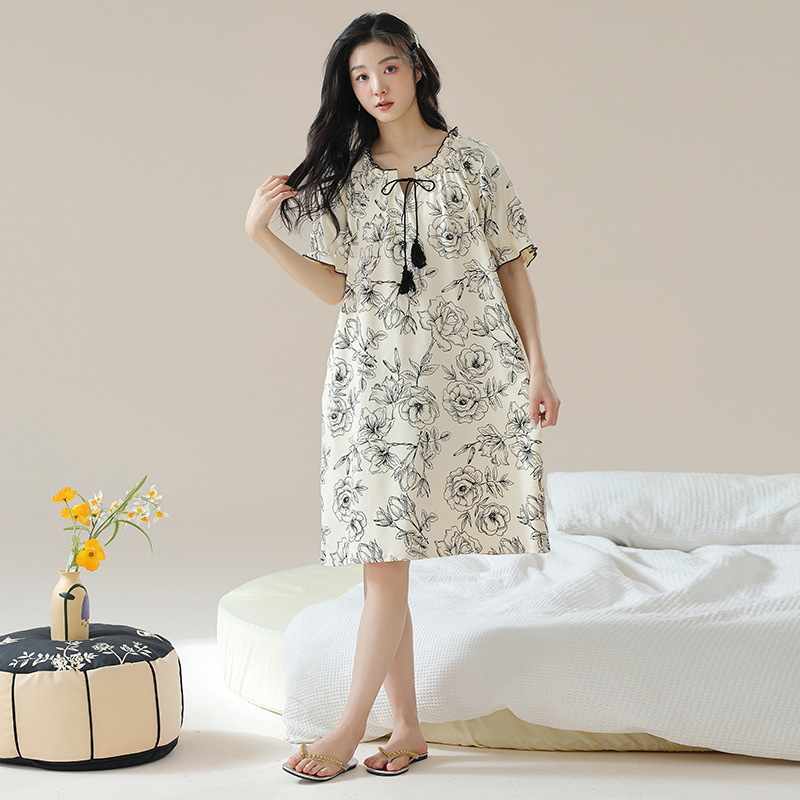 年新款睡裙纯棉米白色短袖妈妈孕妇纯欲风睡衣女夏裙子复古