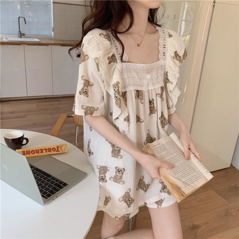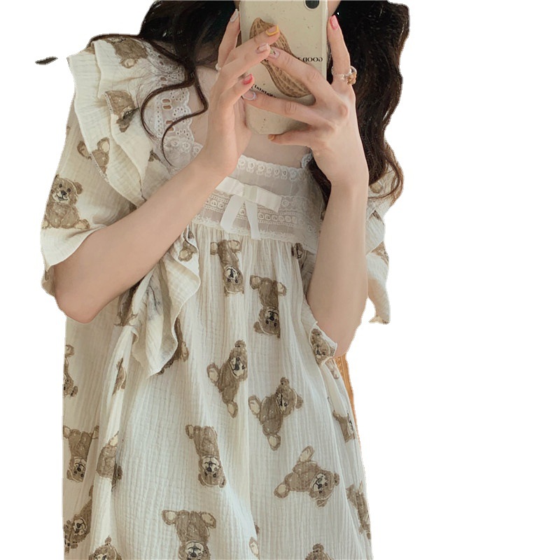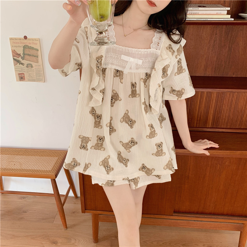 韩国夏季新品可爱卡通小熊少女荷叶边纯棉印花睡衣家居服套装