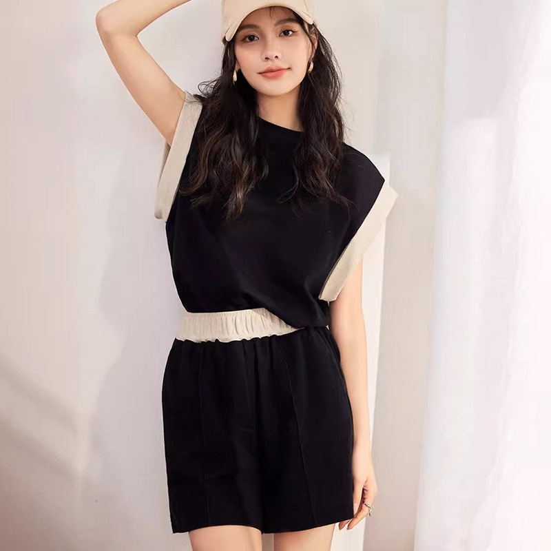 港式复古慵懒人夏日两件套撞色卷边袖T恤+短裤套装运动夏季