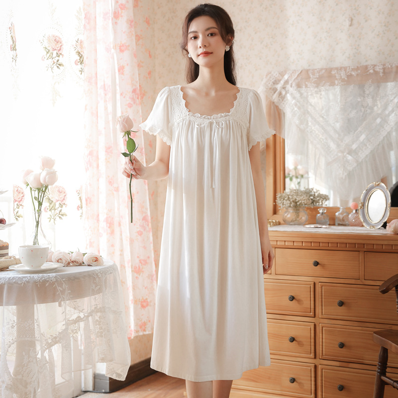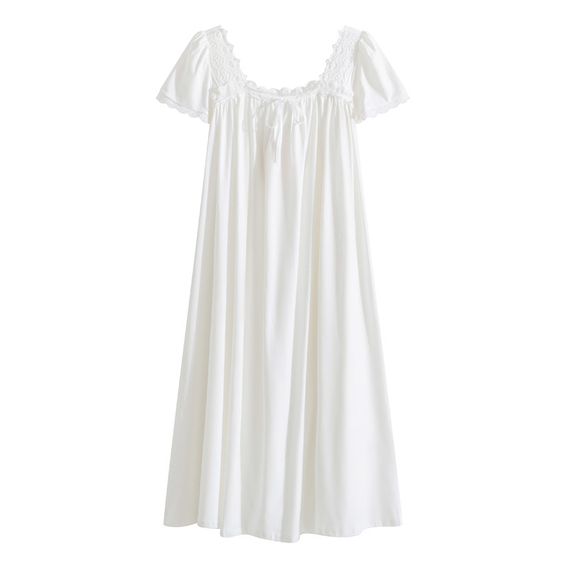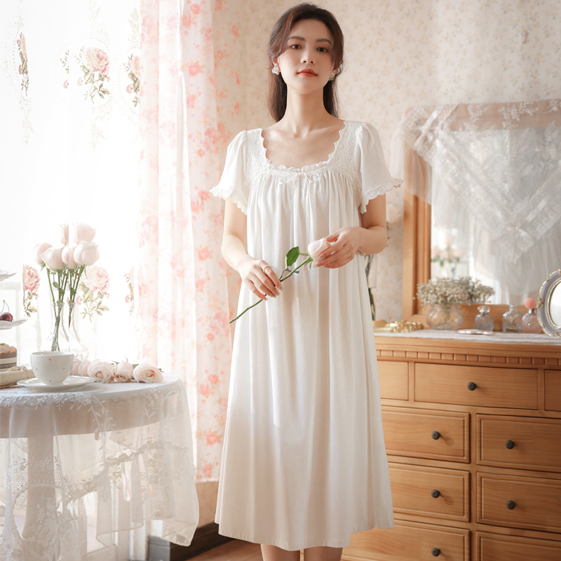 睡裙短袖棉夏新品长款法式复古公主风蕾丝甜美女家居睡衣