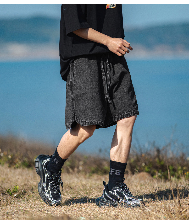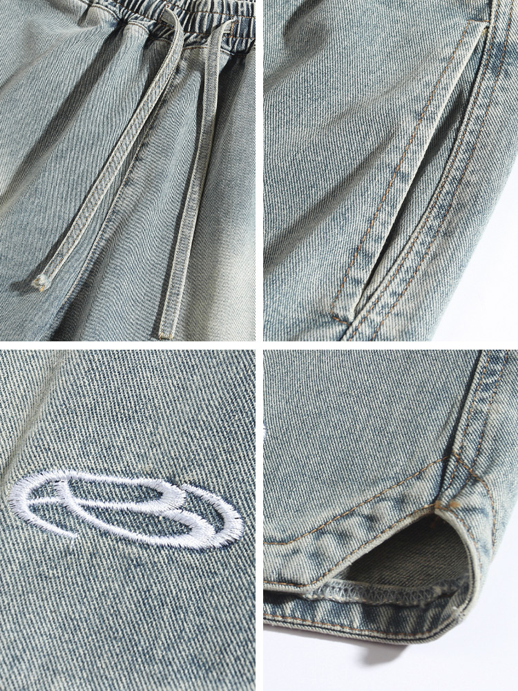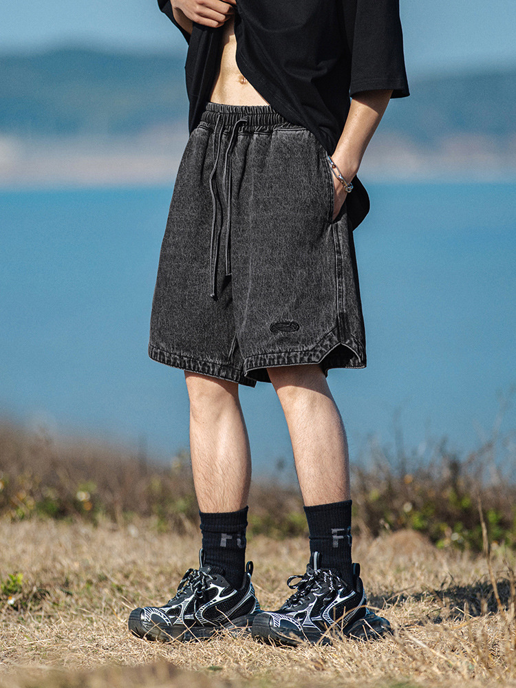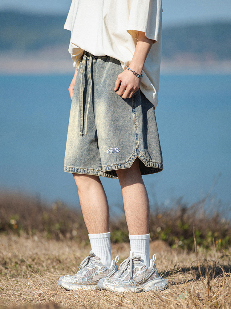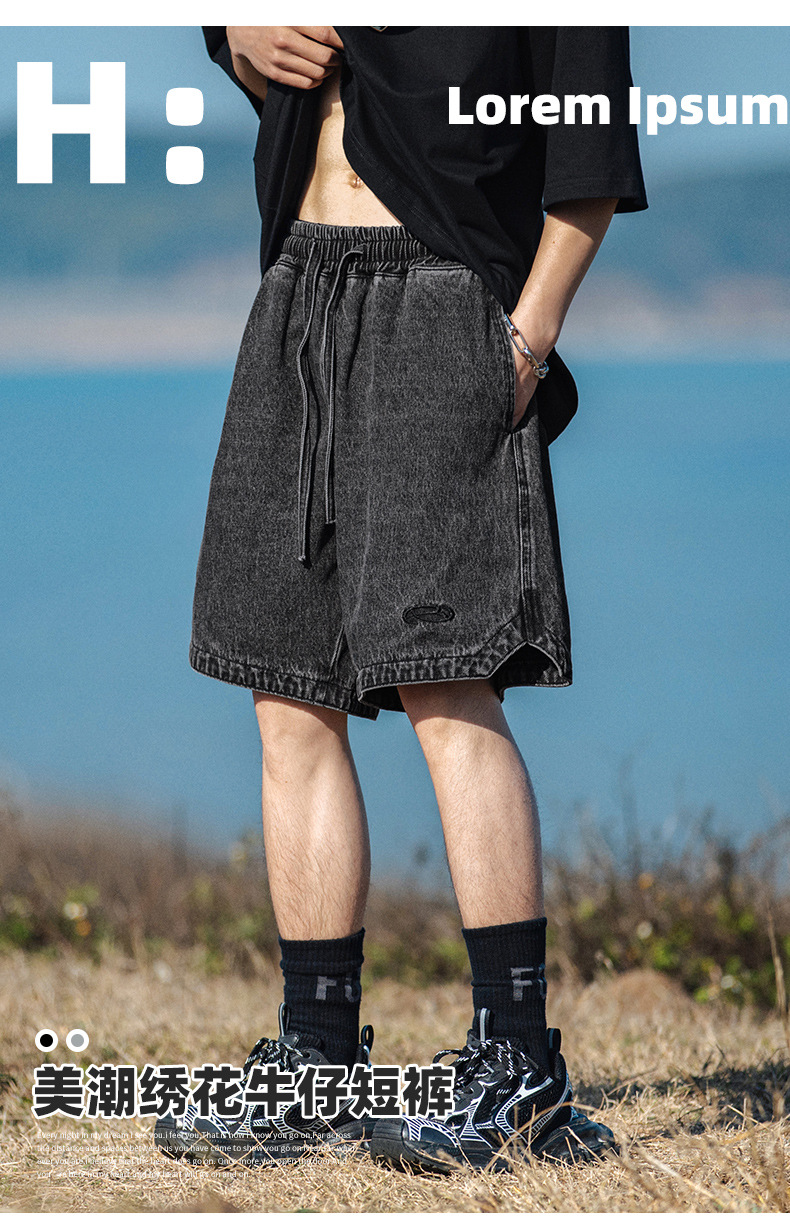 水洗做旧复古牛仔短裤男夏季新款美式复古刺绣三角开叉设计五分裤