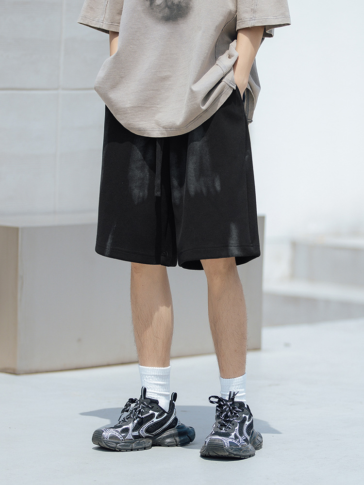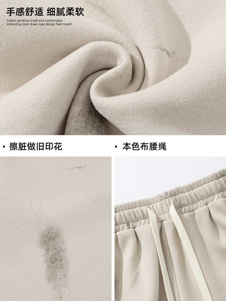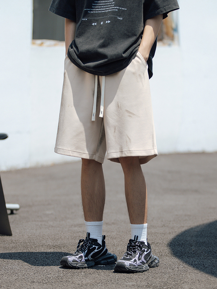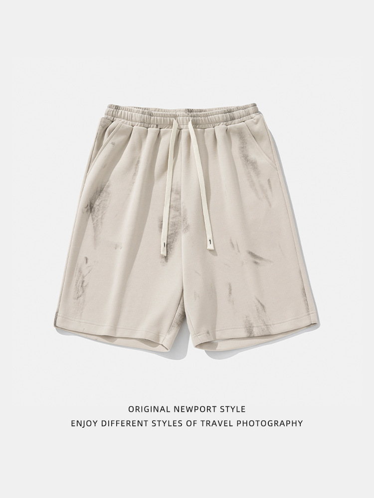美式潮牌擦脏做旧印花短裤男夏新款复古休闲宽松五分裤