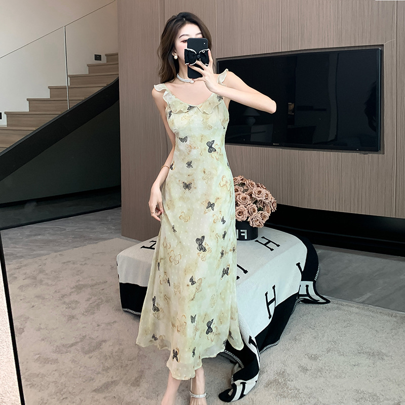 法式春夏高品质新款木耳边气质蝴蝶印花显瘦日常百搭吊带连衣裙子