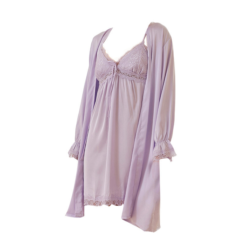 性感蕾丝睡袍仿真丝带胸垫吊带睡裙欧美风睡衣女二件套装新款
