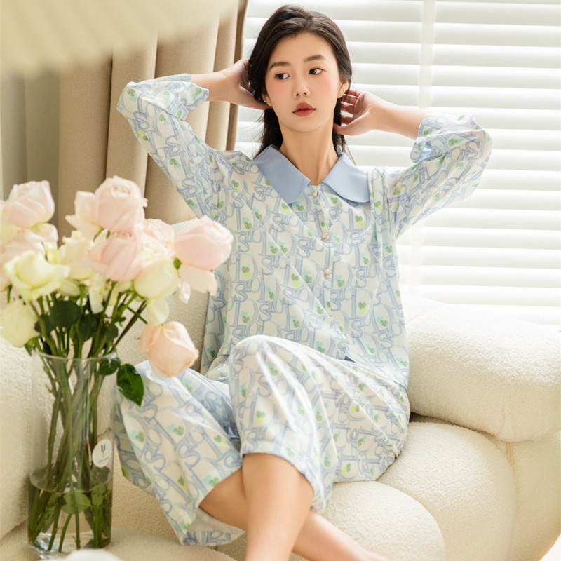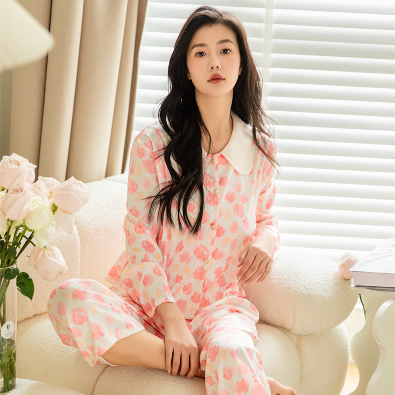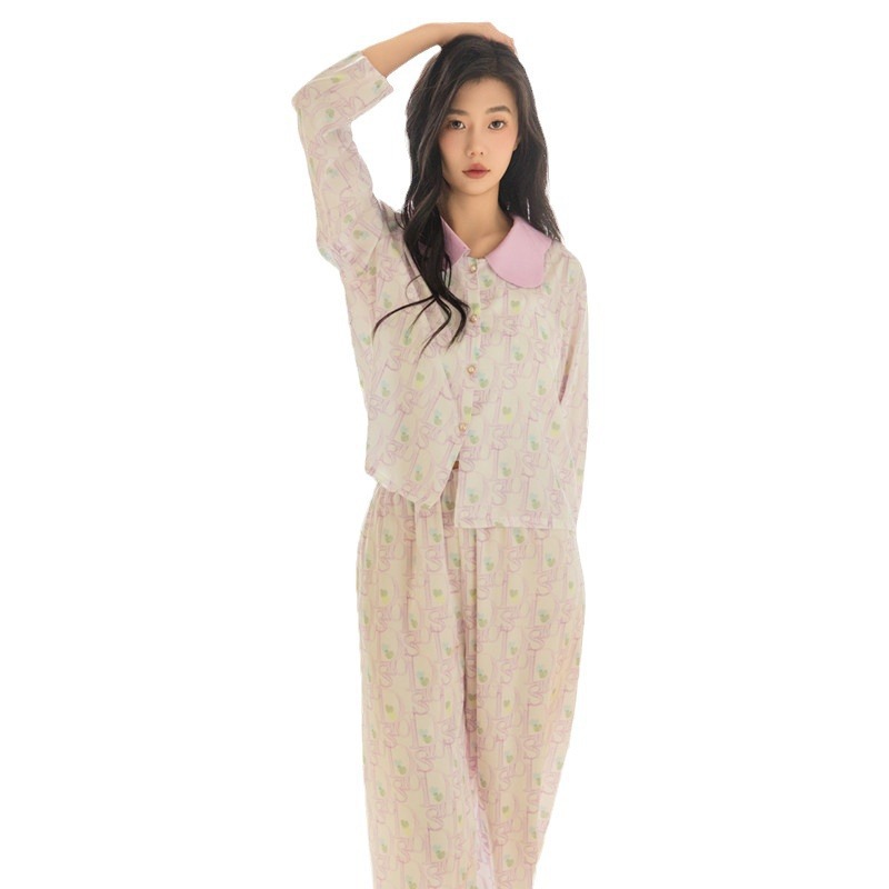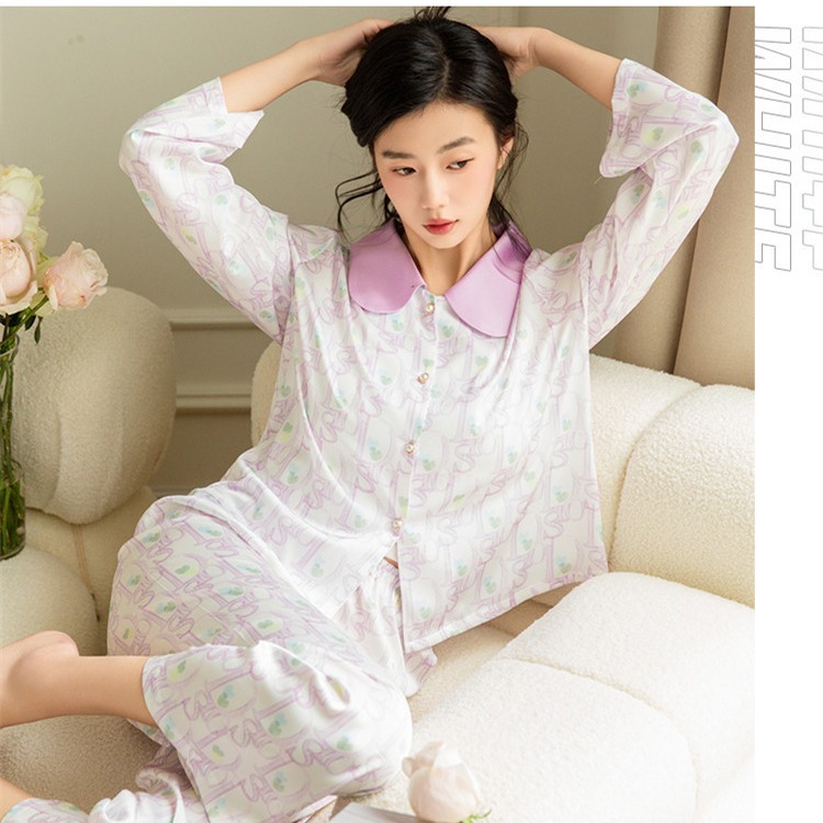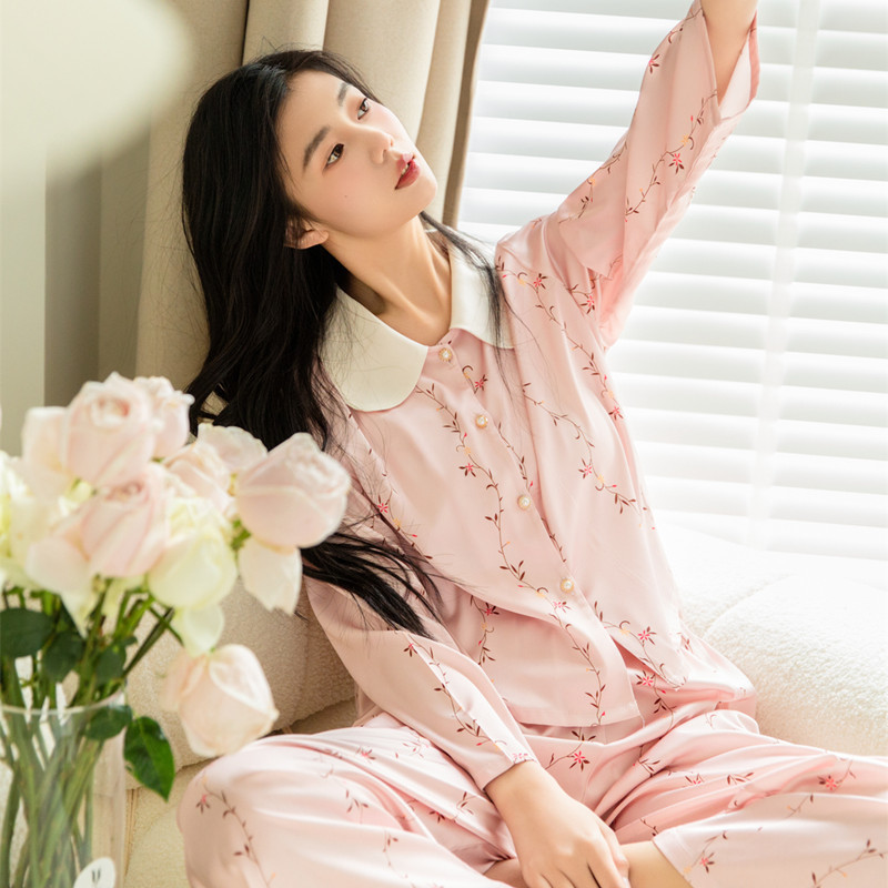 睡衣新款春季冰丝睡衣女薄款花朵印花甜美少女长袖长裤