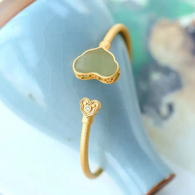 镀S925银镀金镶嵌和田青玉古法设计优雅杏叶中国风可调节手镯