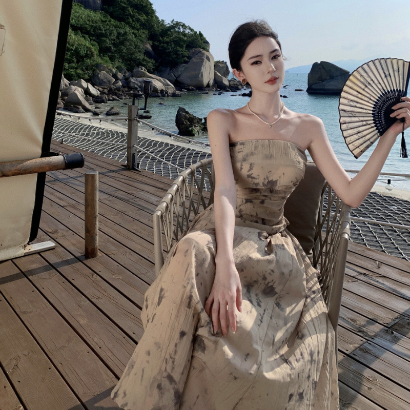 实拍水墨印花抹胸上衣+半身裙套装显瘦收腰套装裙简约气质超修身