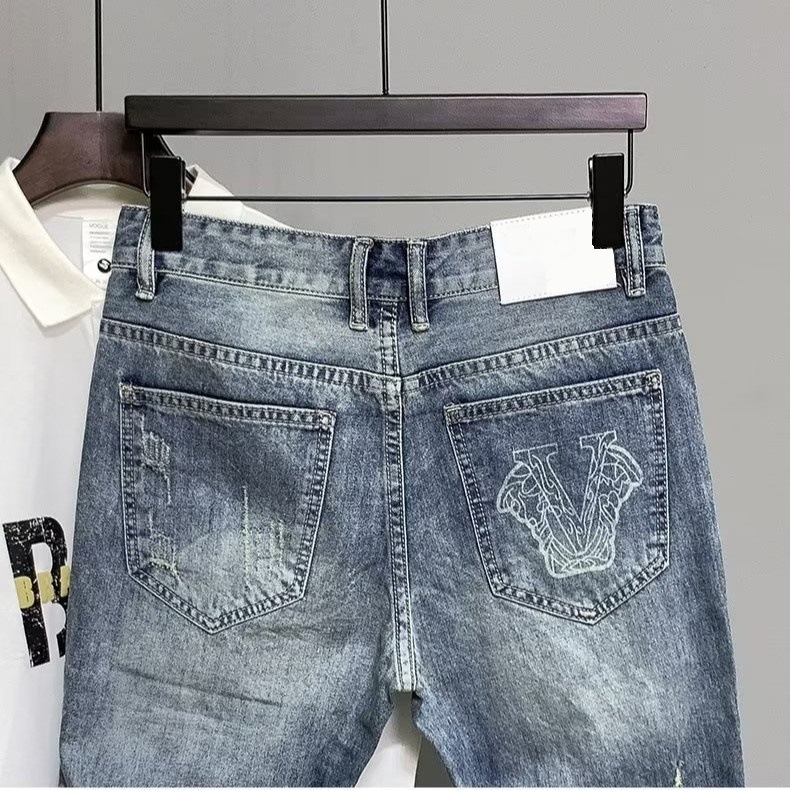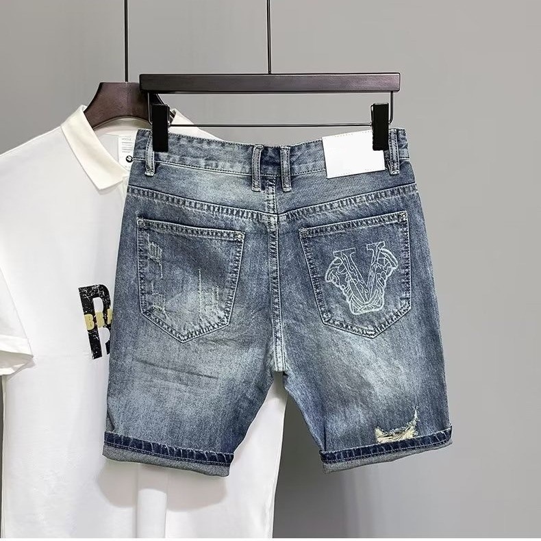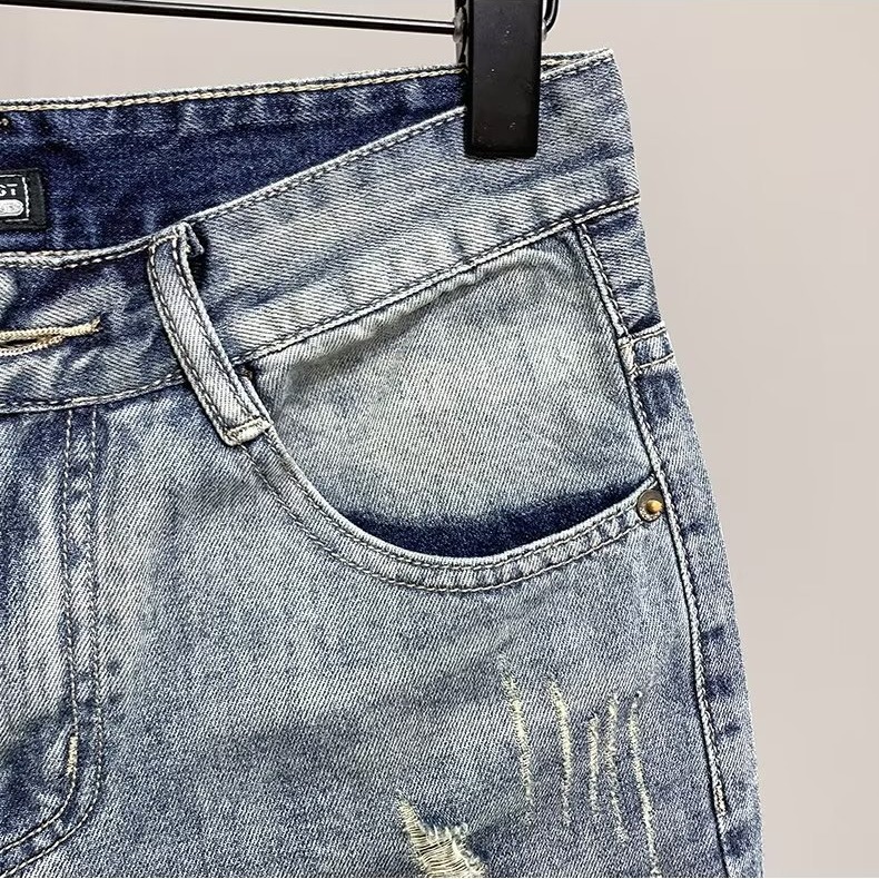 潮牌牛仔短裤男破洞泼墨涂鸦五分修身直筒韩版重磅洗水中裤