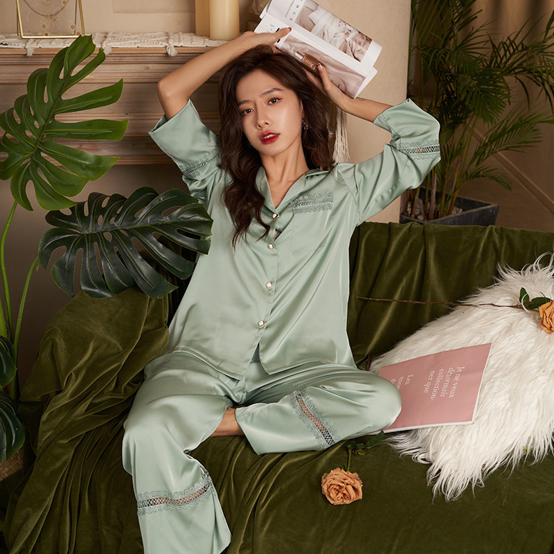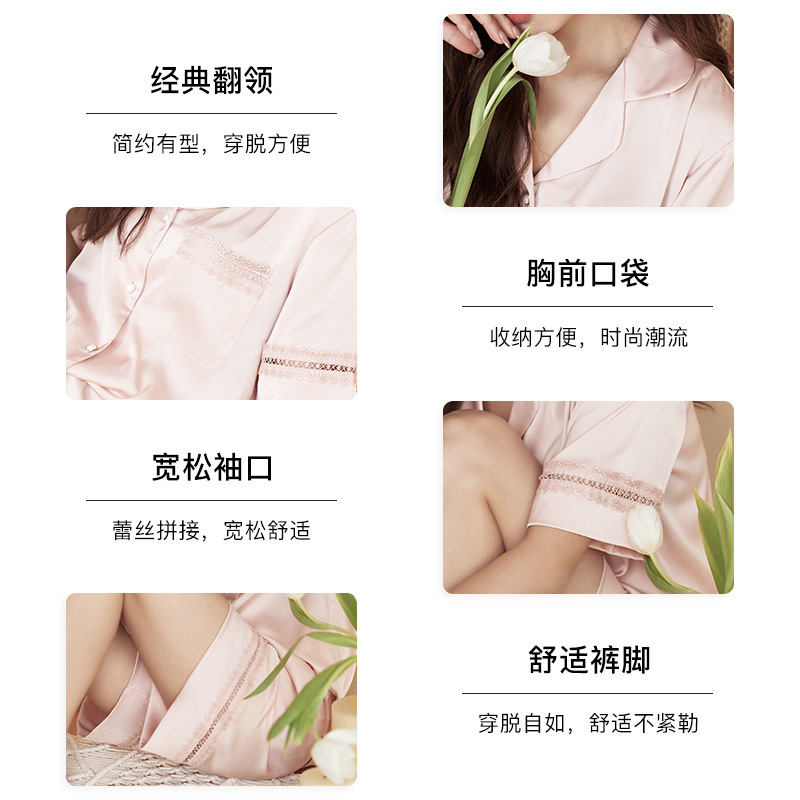 睡衣女士夏季丝绸冰丝短袖短裤蕾丝拼接家居服夏天薄款仿真丝套装