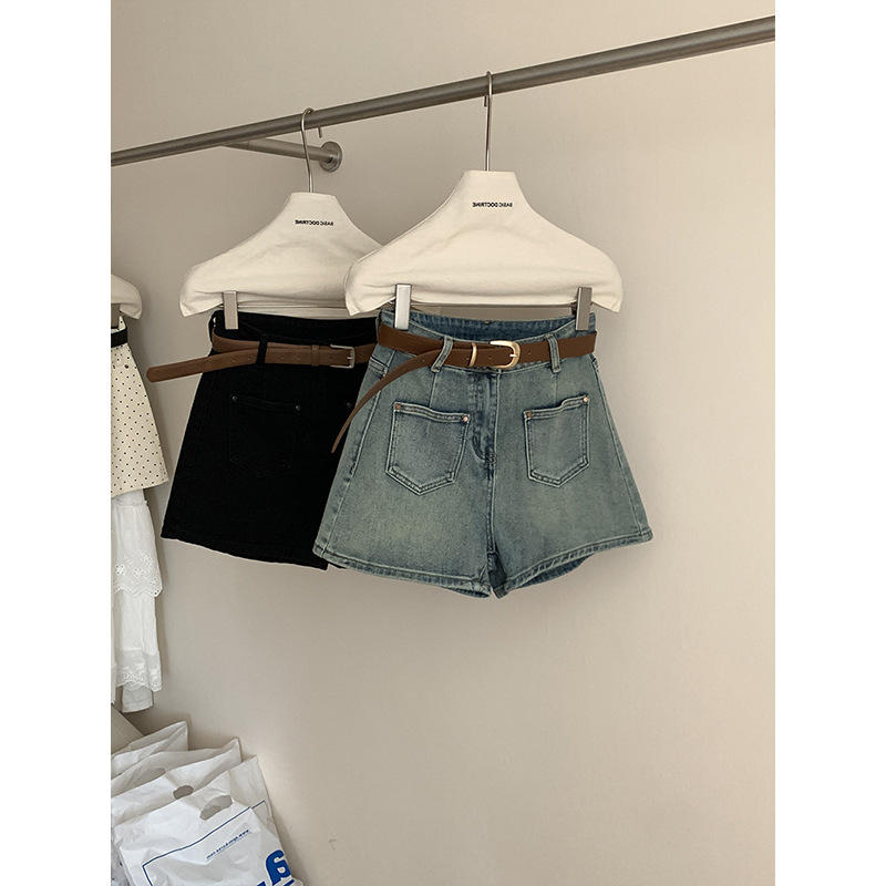 口袋小设计复古高腰直筒牛仔裤女 夏韩版简约短裤女