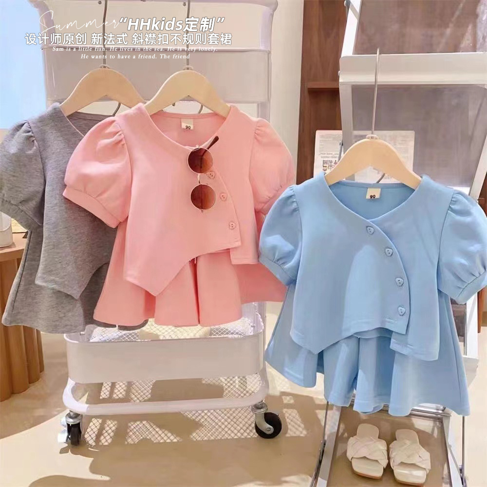 新品女童套装小V领不规则泡泡袖外套百褶短裙两件套2025夏装中小