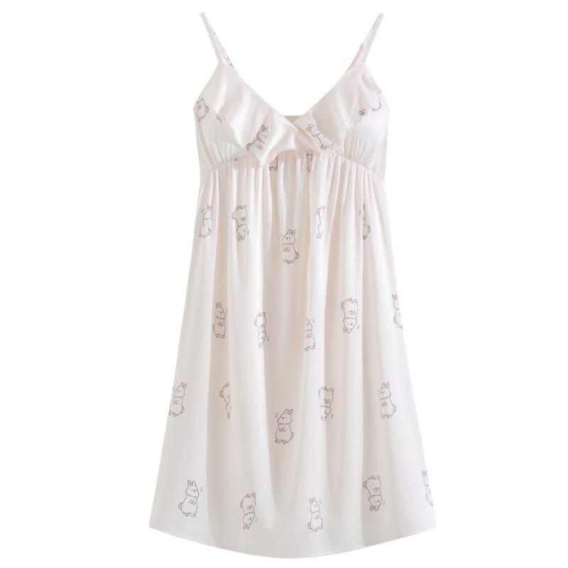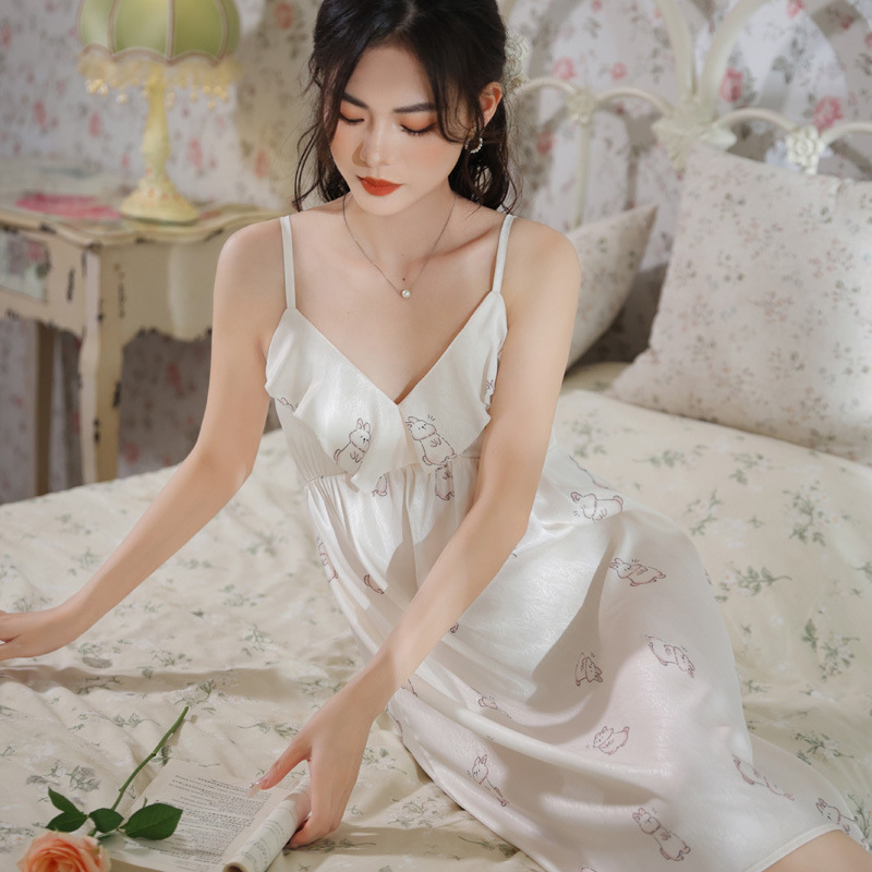 薄款吊带睡裙女夏季印花可爱中长款冰丝睡衣裙带胸垫可外穿家居服