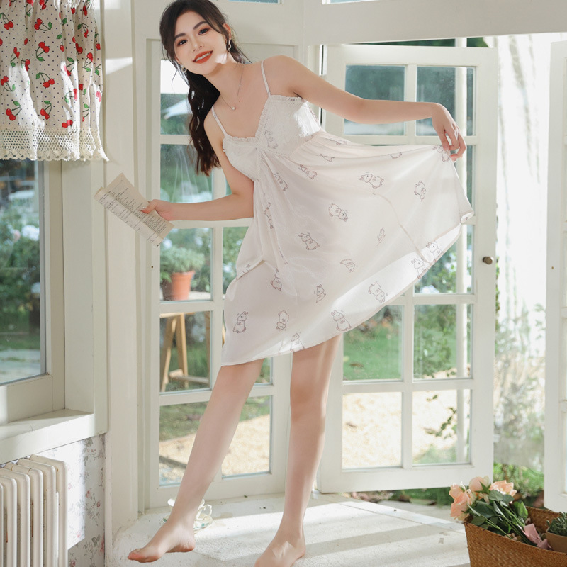 薄款吊带睡裙女夏季印花宫廷风短款冰丝睡衣裙带胸垫可外穿家居服