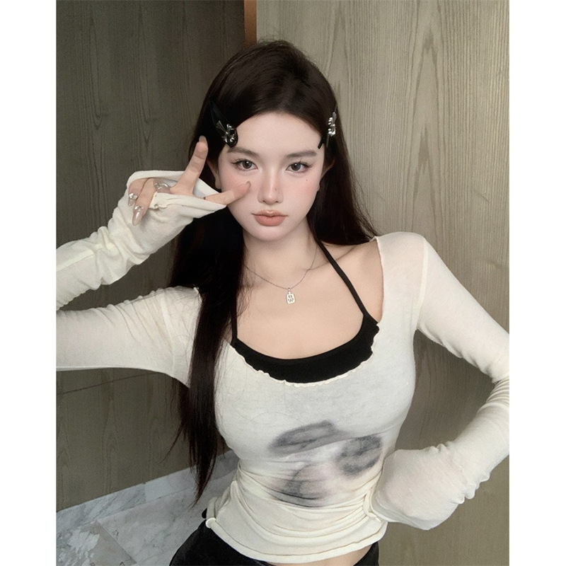美式复古独特别致长袖T恤女打底衫春秋设计感小众遮肉显瘦甜辣妹