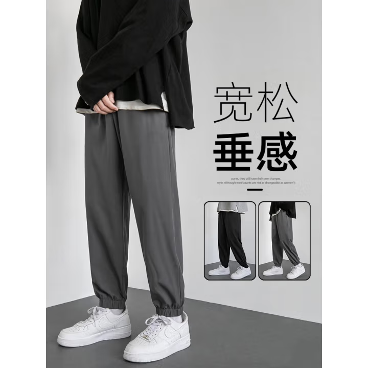 男士春秋款夏季宽松直筒冰丝九分薄款阔腿运动休闲长裤子