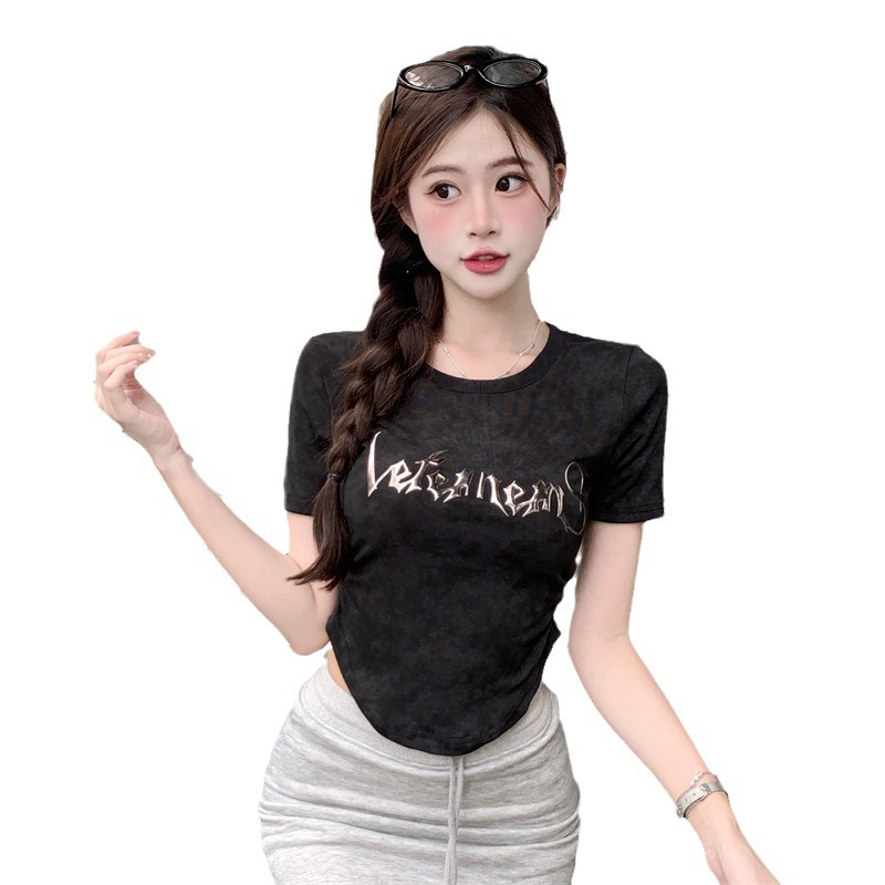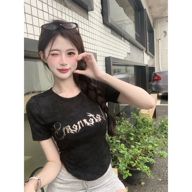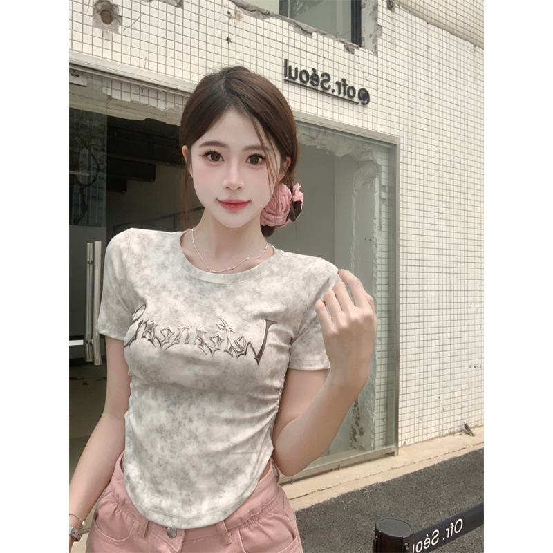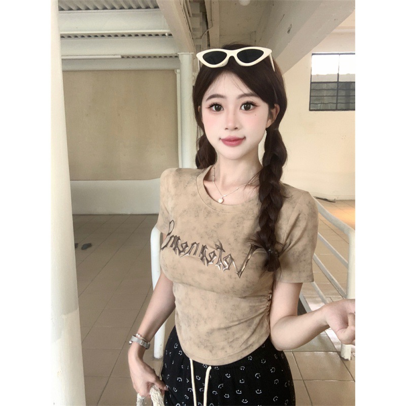 美式复古收腰褶皱扎染短款T恤夏季新款大码胖mm显瘦遮肉短袖上衣