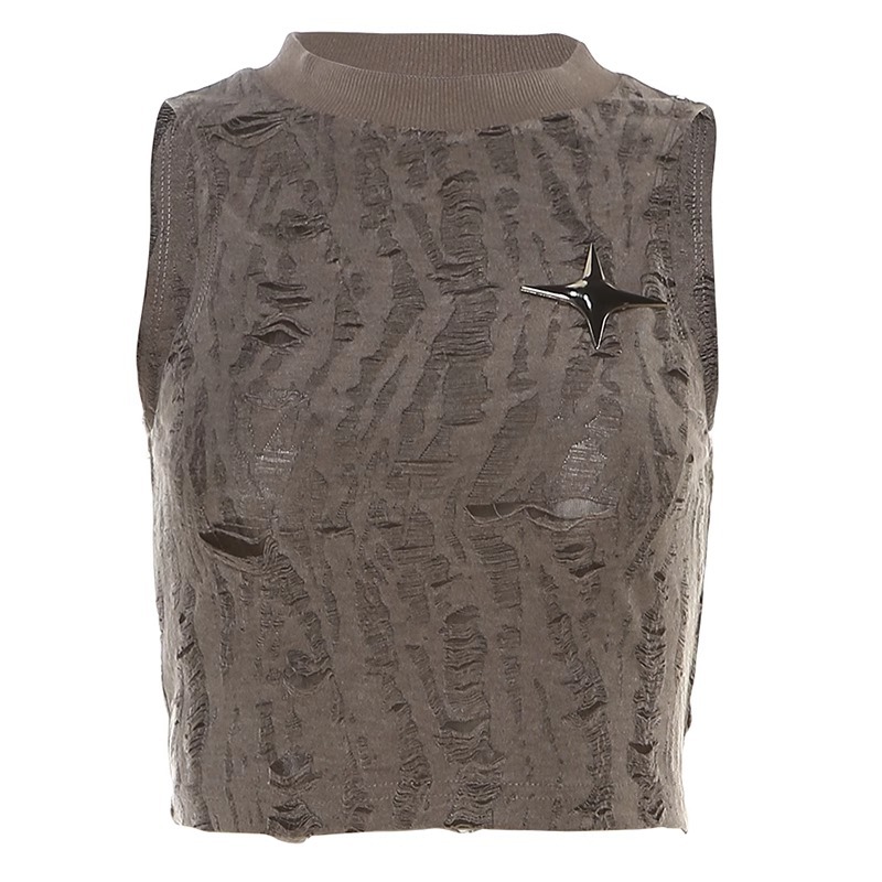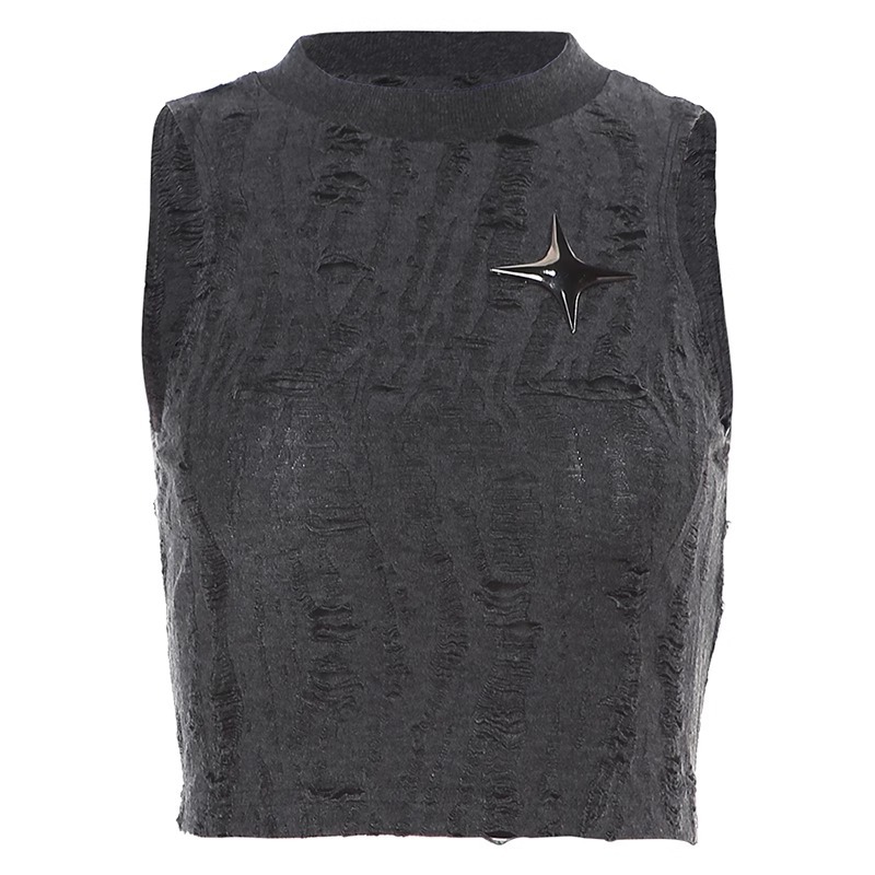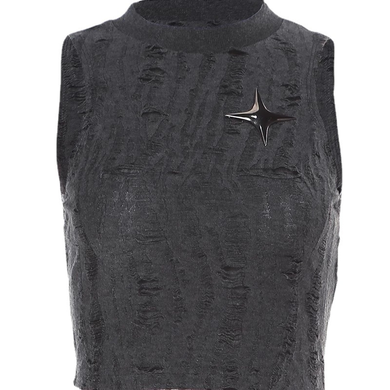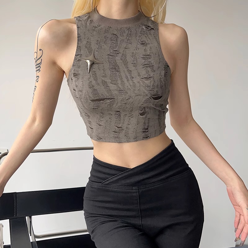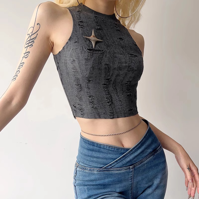 美式高街复古破洞无袖背心女短款显瘦高腰露脐辣妹上衣夏