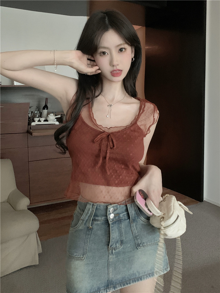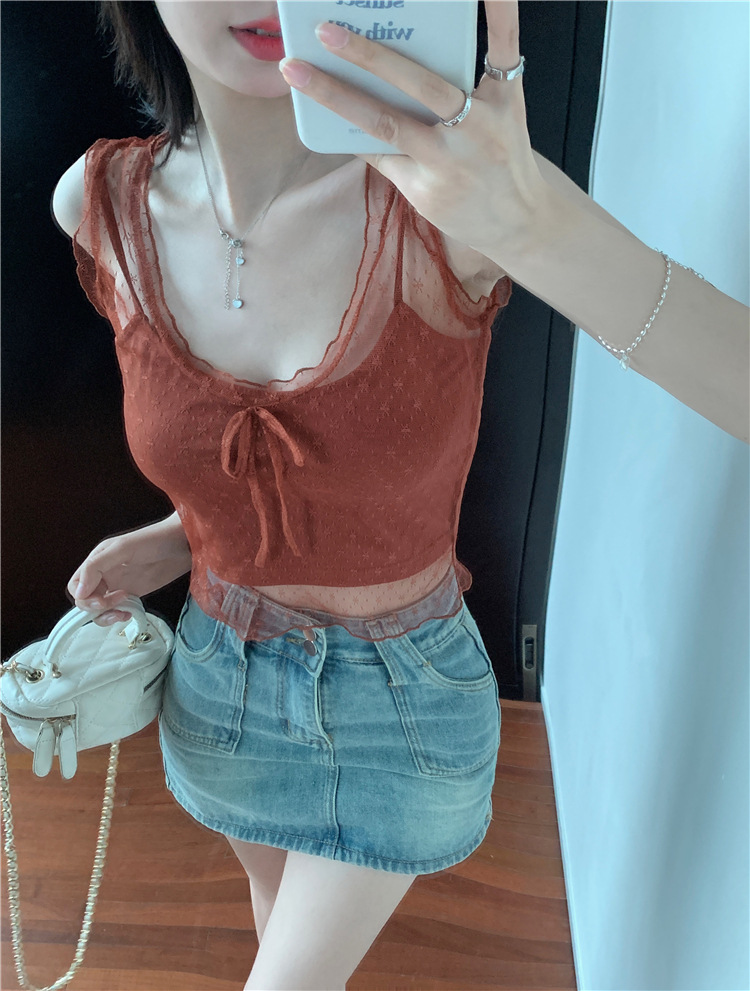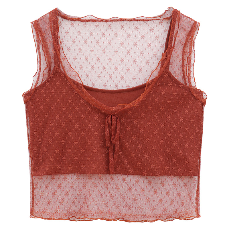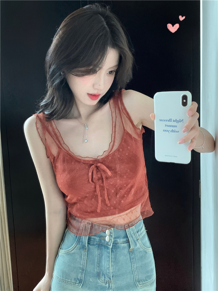 美式复古红棕色吊带背心女春季新款辣妹蝴蝶结蕾丝罩衫两件套