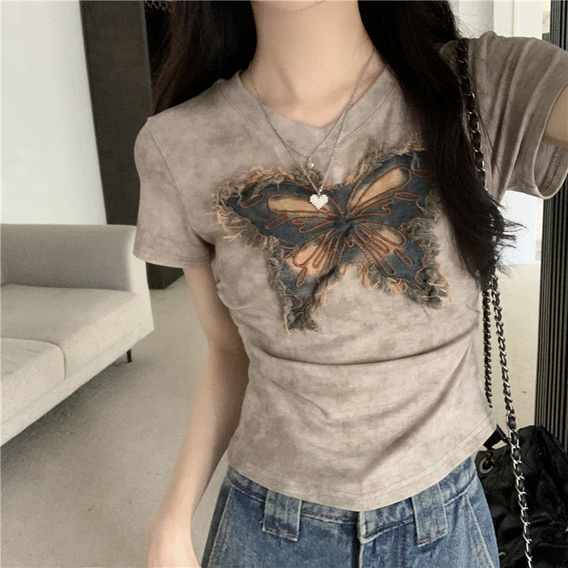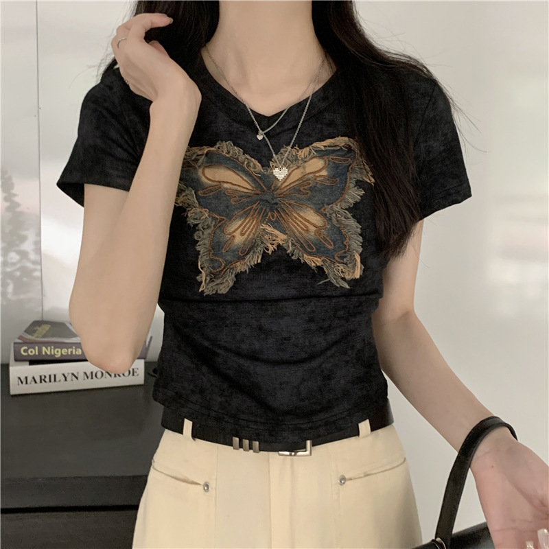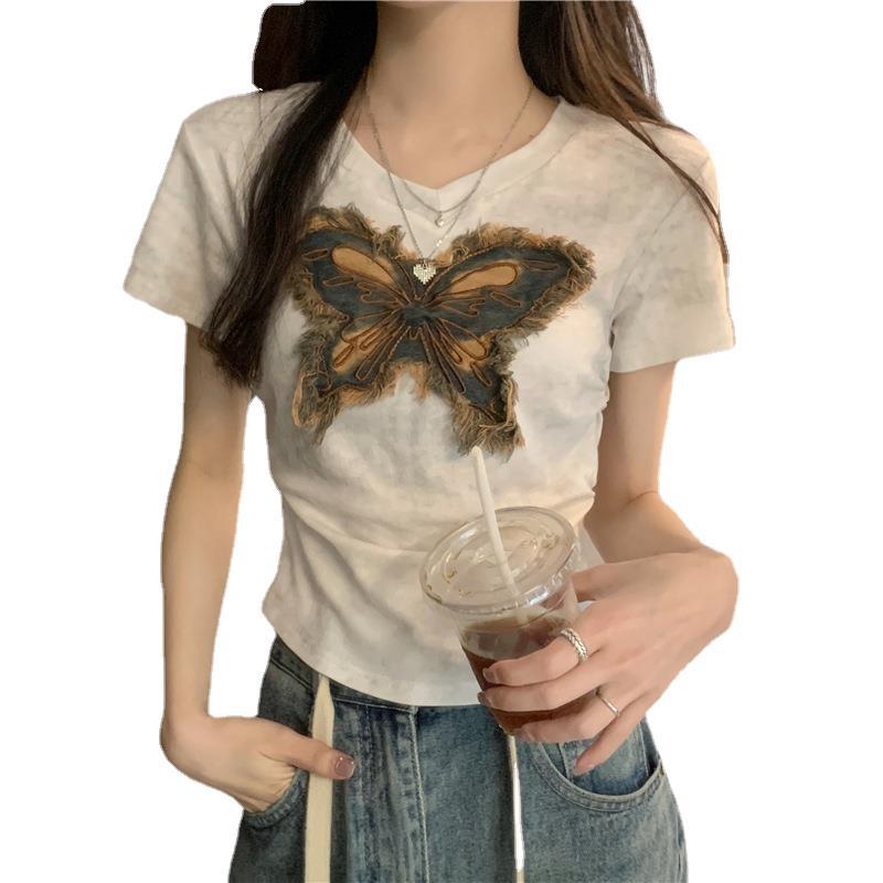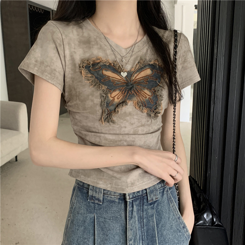 美式复古v领扎染短袖T恤女夏季设计感小众甜辣妹别致短款上衣