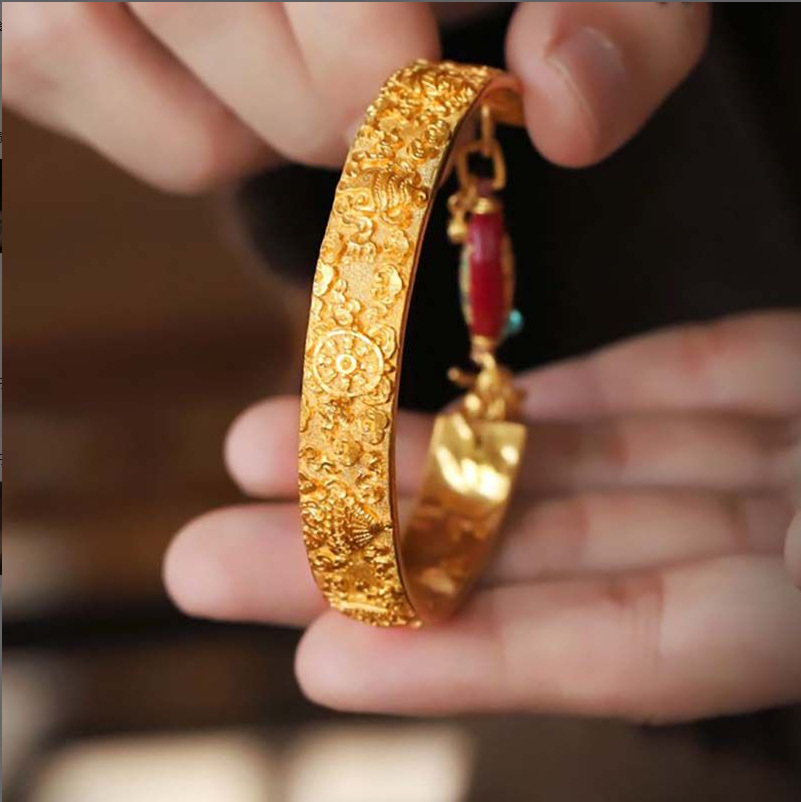 中国风古法珐琅金鱼锁浮雕手工錾刻八宝手镯复古时尚国潮手环手饰