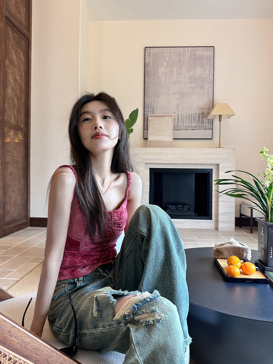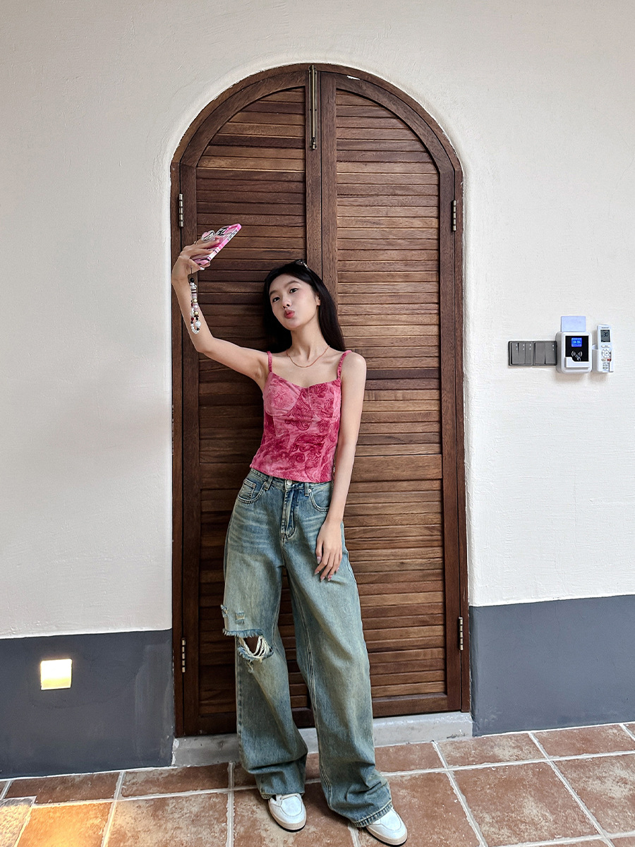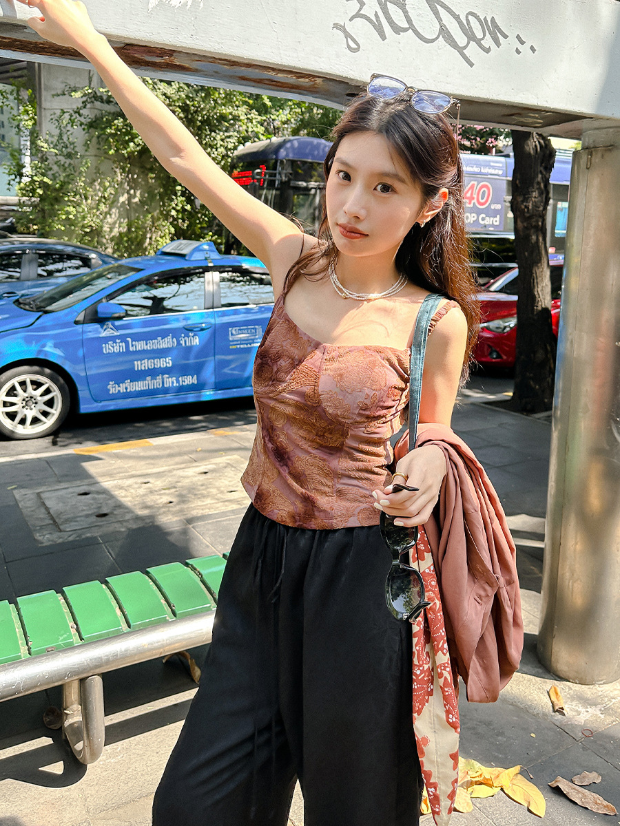 美式复古辣妹风植绒绣花带胸垫修身吊带衫背心女
