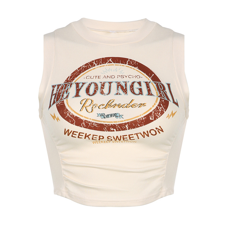 美式复古风辣妹修身无袖撞色字母印花不规则短款露脐褶皱上衣