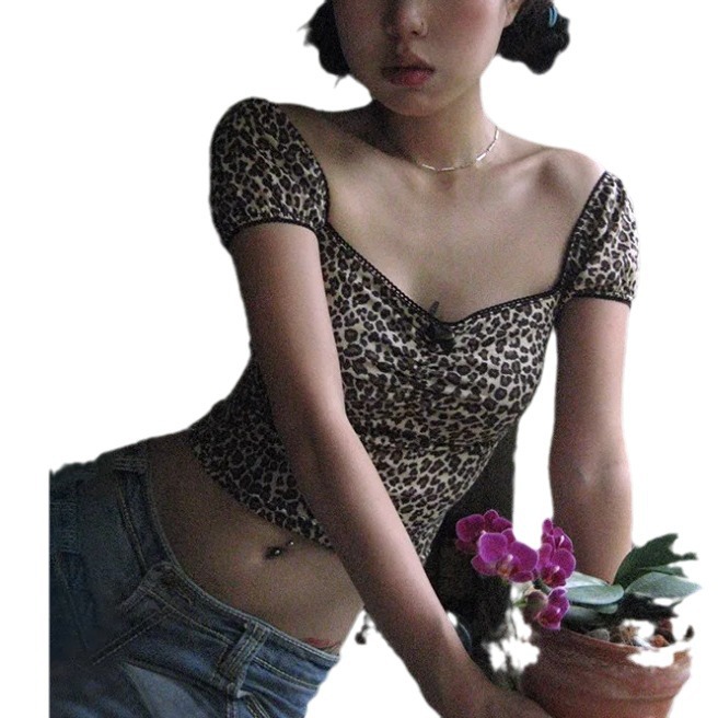 y2k亚文化豹纹上衣t恤女甜酷辣妹修身显瘦一字肩短袖女装春夏新款