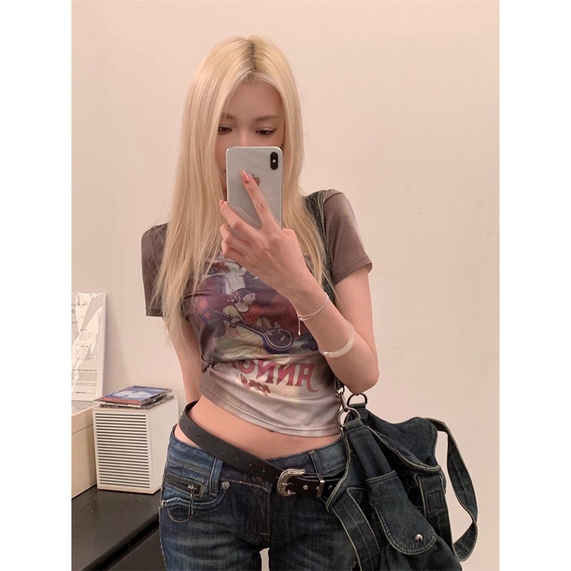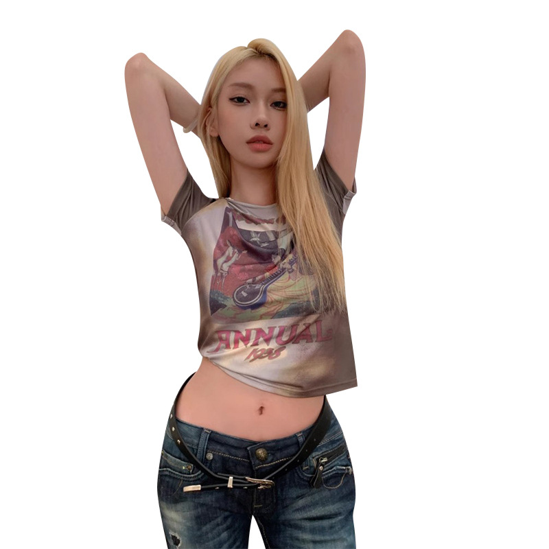 美式新款创意晕染印花圆领T恤女夏季复古设计感修身辣妹短袖上衣