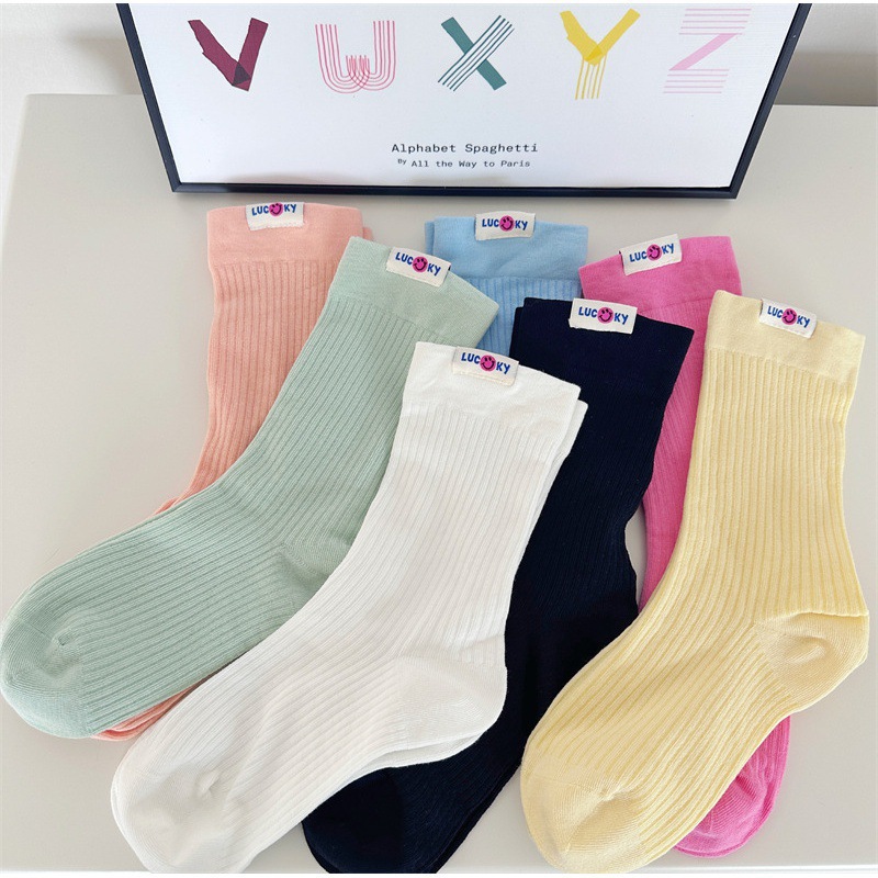 春夏新款ins男女袜笑脸中筒袜布标女士堆堆竖条纯色日系