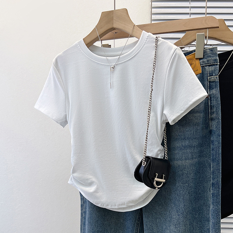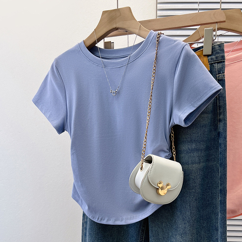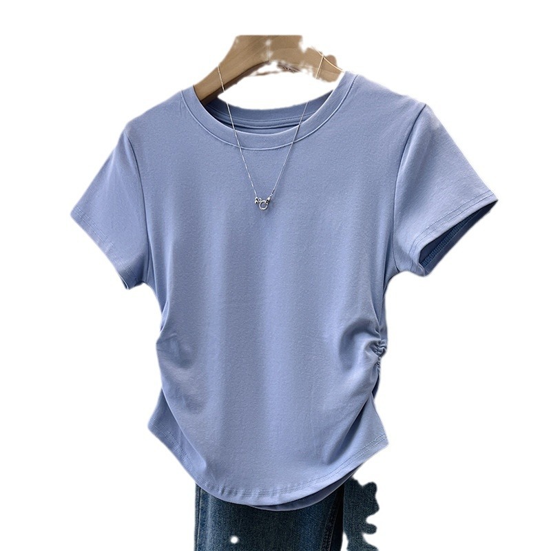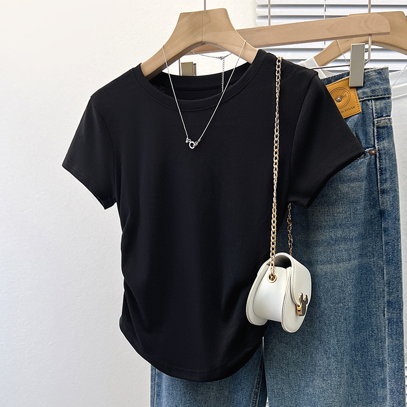 实拍正肩短袖T恤女夏季韩版收腰褶皱短款半袖体恤美式辣妹上衣