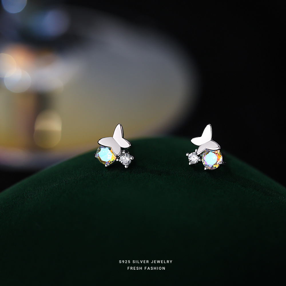s925纯银原创彩色闪钻蝴蝶耳钉女韩版超闪轻奢小众轻奢感耳饰耳环
