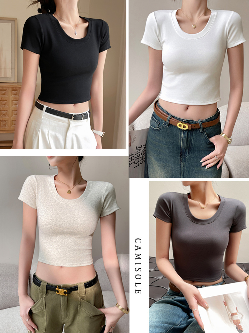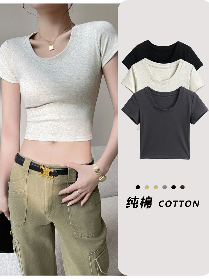 纯棉正肩短袖t恤女士春夏季可外穿辣妹短款修身美式酷辣上衣