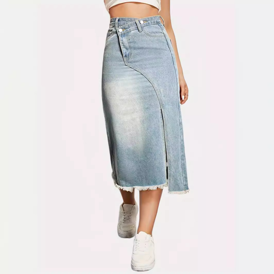 春夏季新款跨境美式复古牛仔半身裙女时尚开叉拼接中长款a字裙