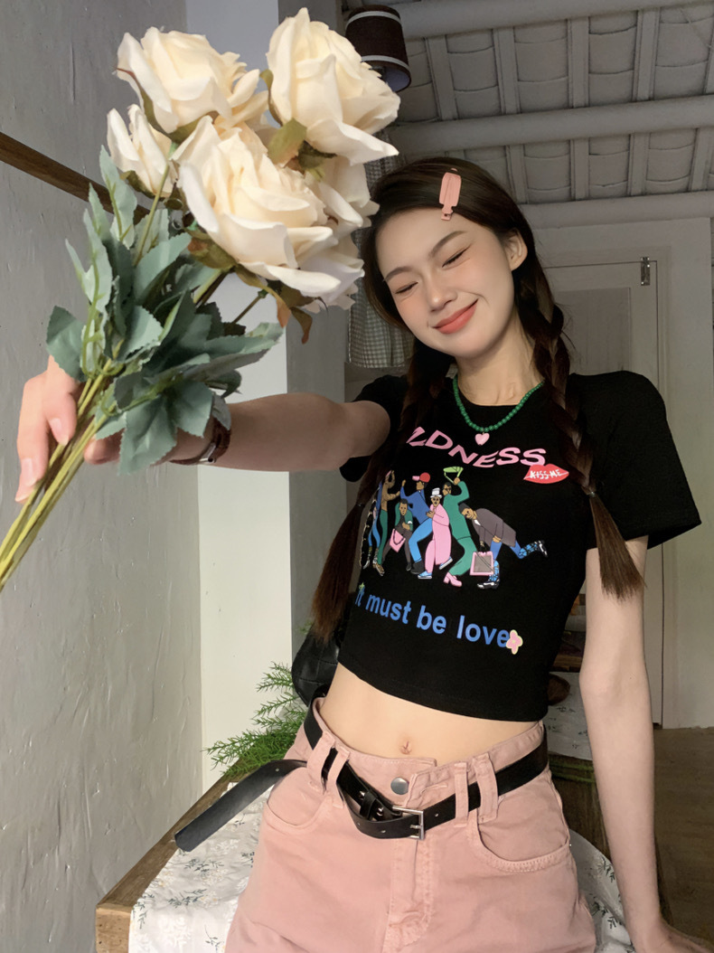 美式复古黑色短袖T恤夏季新款甜酷辣妹高腰显瘦露脐短款上衣ins潮