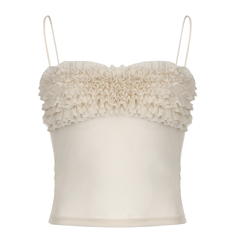 小众风设计多层木耳边低领吊带美式辣妹性感透视网纱薄款背心上衣