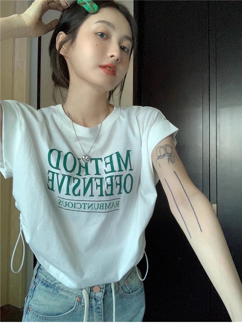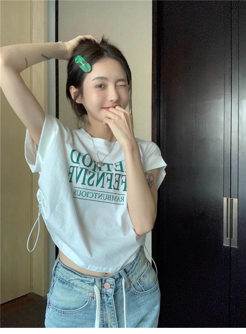 甜辣妹美式复古设计感正肩短袖T恤女夏季收腰短款露脐抽绳上衣ins