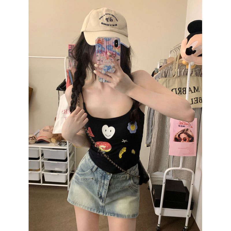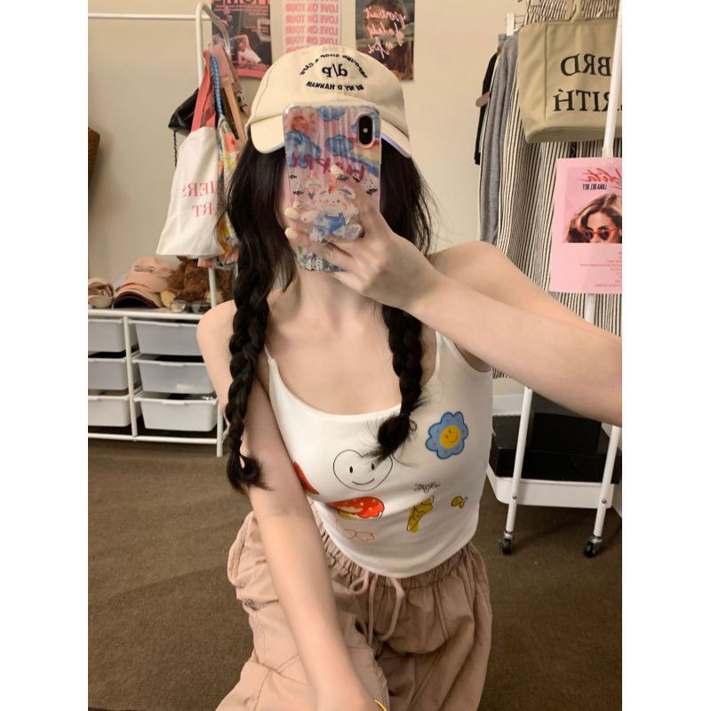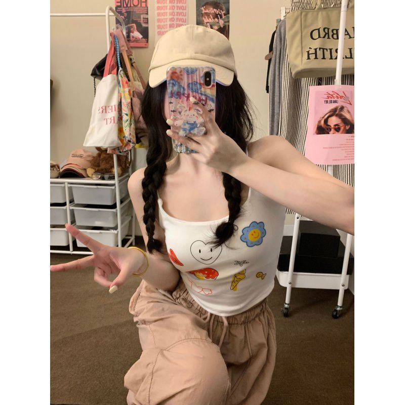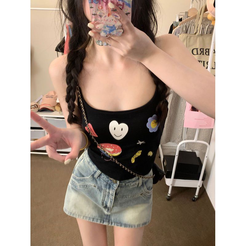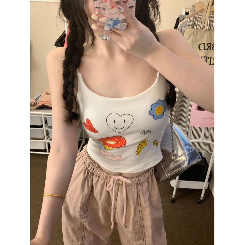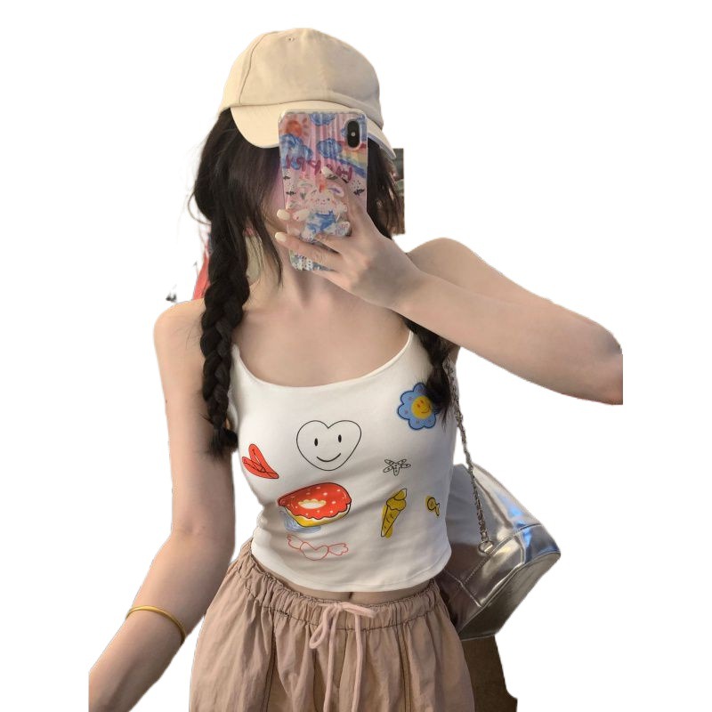 甜辣性感纯欲印花带胸垫小吊带背心女内搭夏季短款露脐外穿上衣潮
