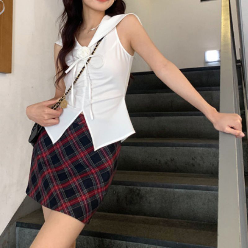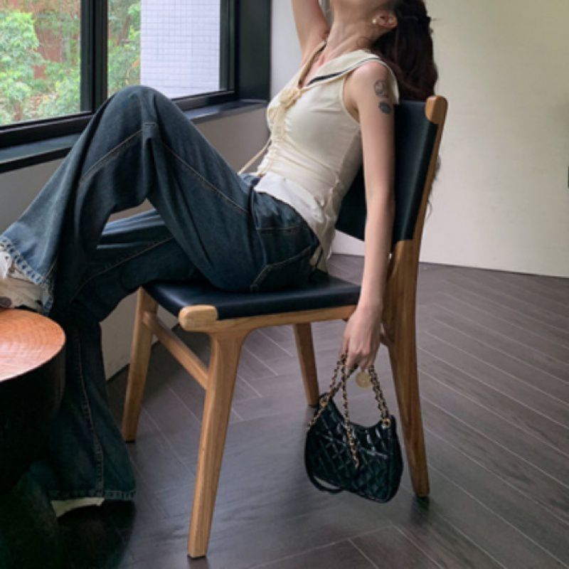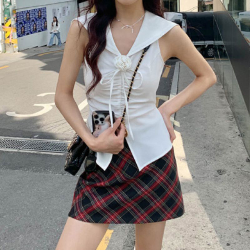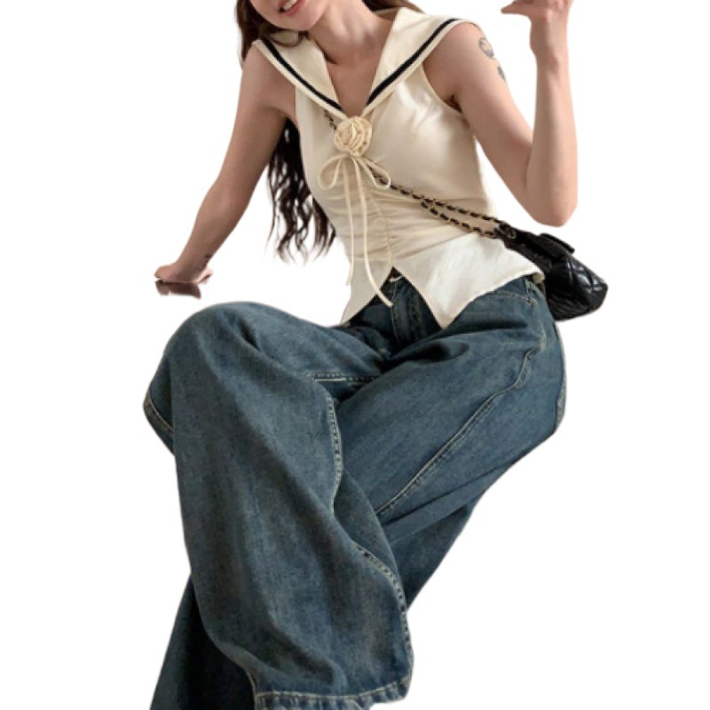年韩版时尚新款修身 海军领削肩褶皱背心女无袖收腰上衣潮