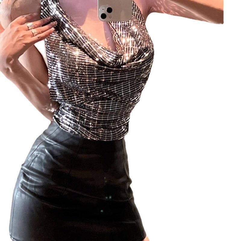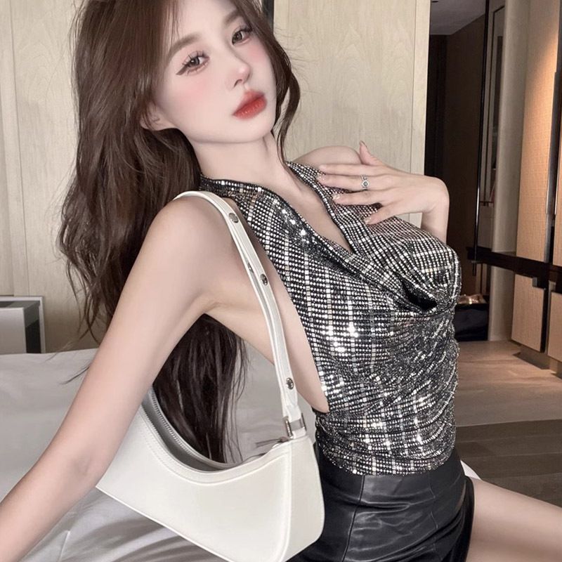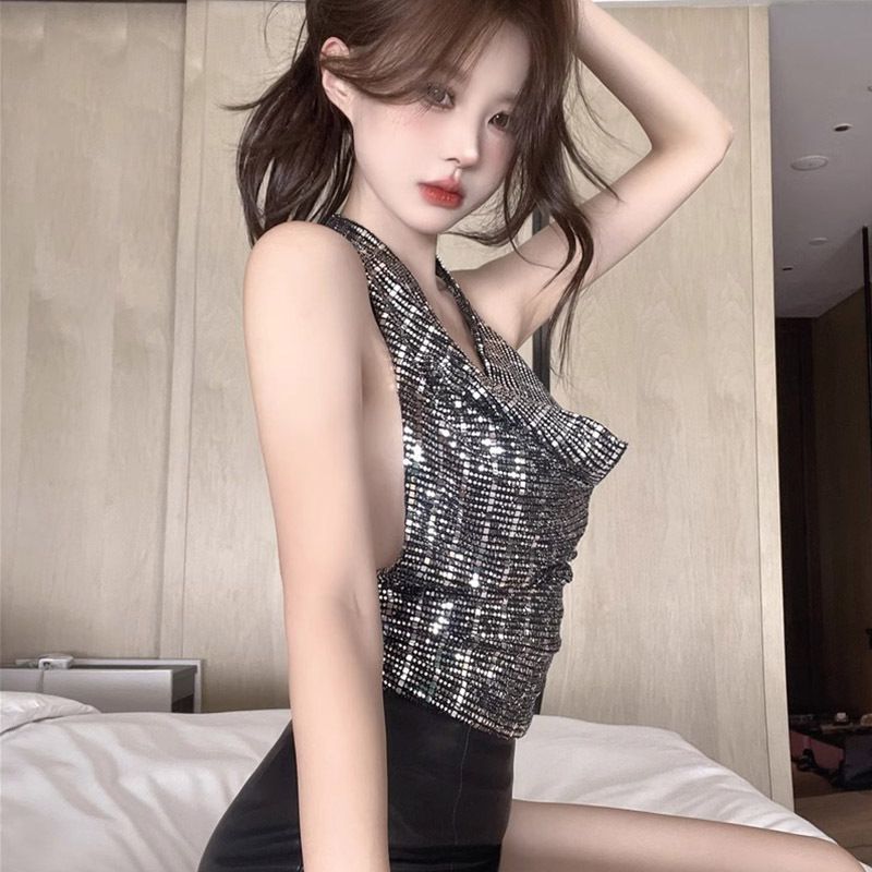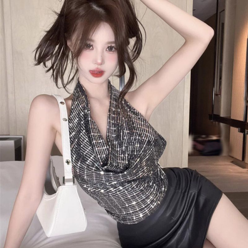 纯欲风辣妹亮片挂脖吊带背心女夏季短款亮闪闪露背高级感上衣