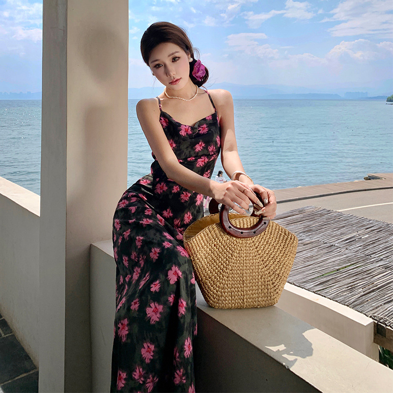 纯欲风海边度假风吊带连衣裙露背绑带碎花收腰长裙