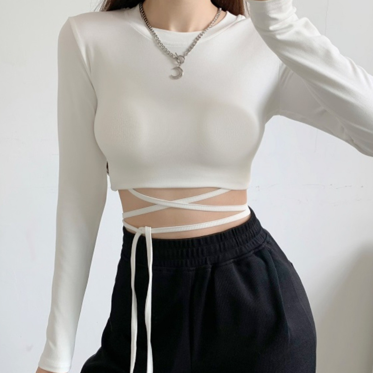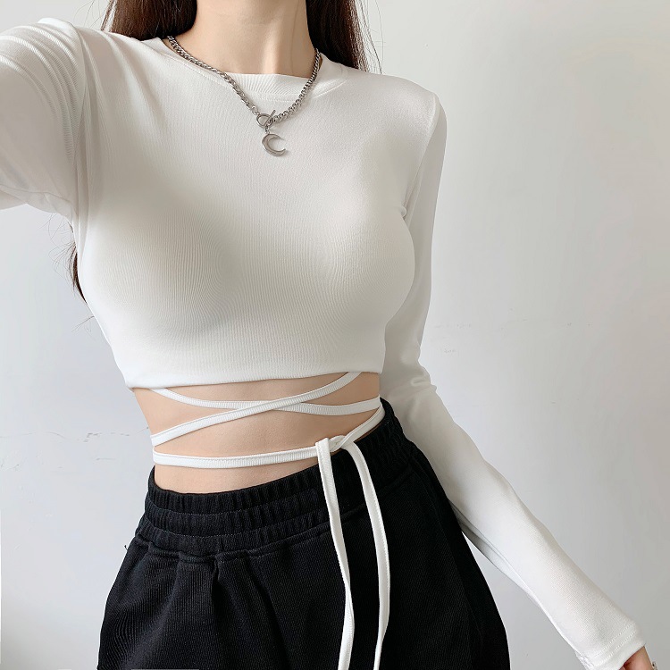美式甜辣妹性感爵士舞长袖T恤女紧身绑带设计感小众短款露脐上衣