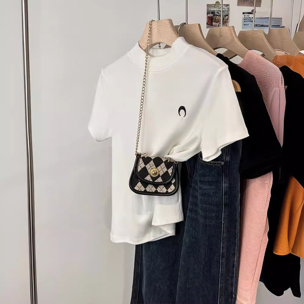 广州十三行爆款韩版辣妹小立领短袖t恤女装小众纯棉刺绣正肩上衣
