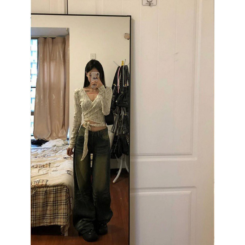 美式复古领低胸长袖恤女早秋季修身显瘦设计感小众辣妹短款上衣