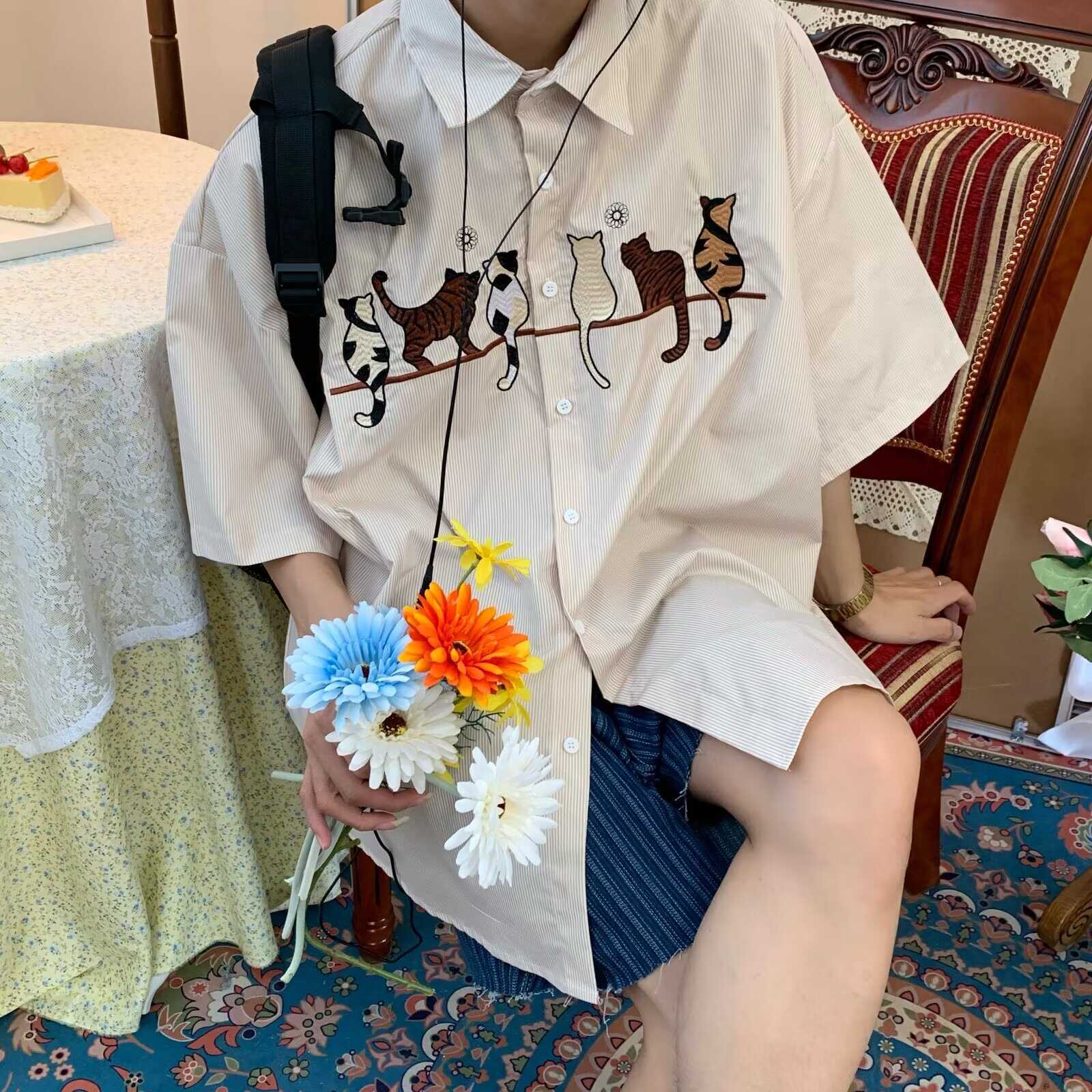 同款夏季古着感复古日系百搭细条纹猫咪刺绣短袖衬衫情侣休闲慵懒