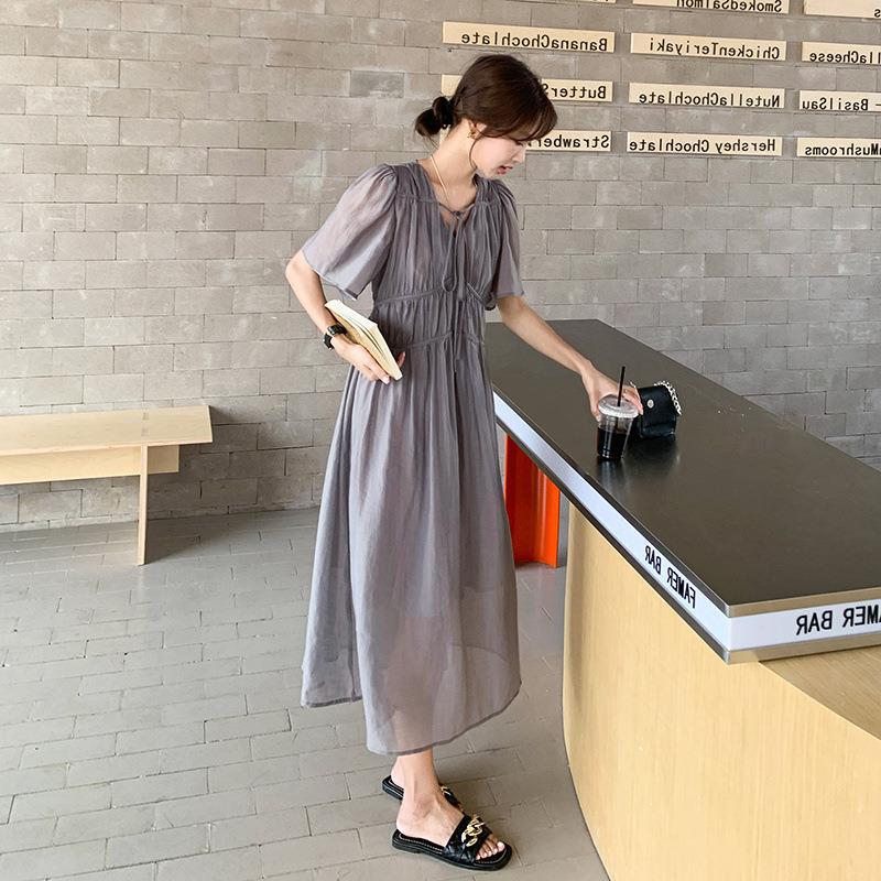 实拍V领蝴蝶结系带拼接褶皱设计ins小众烟灰色优雅显瘦气质连衣裙