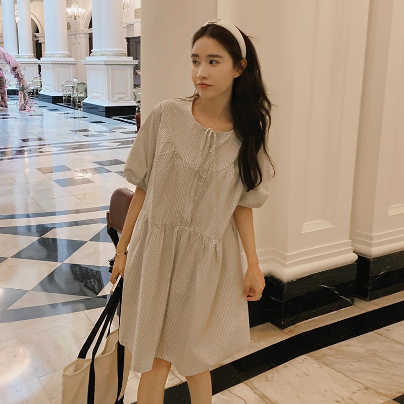 法式条纹裙子系带宽松娃娃裙连衣裙女装韩国东大门夏季新款