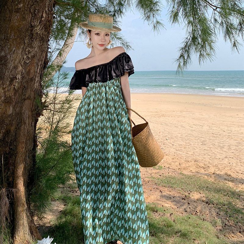 黑荷叶翠鸟提花礼服裙三亚海边旅游拍照沙滩裙气质长款连衣裙