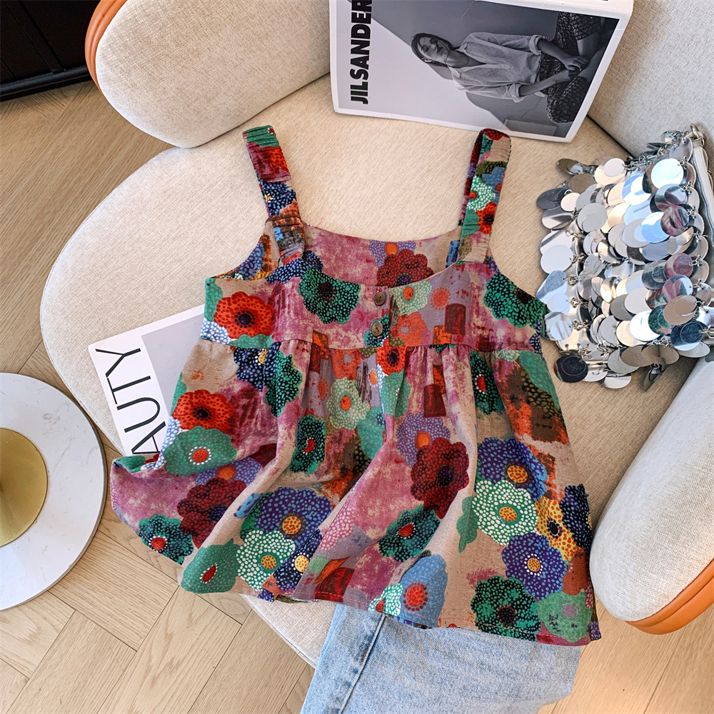 复古油画印花吊带背心女夏季度假风穿搭小个子宽松无袖娃娃衫上衣