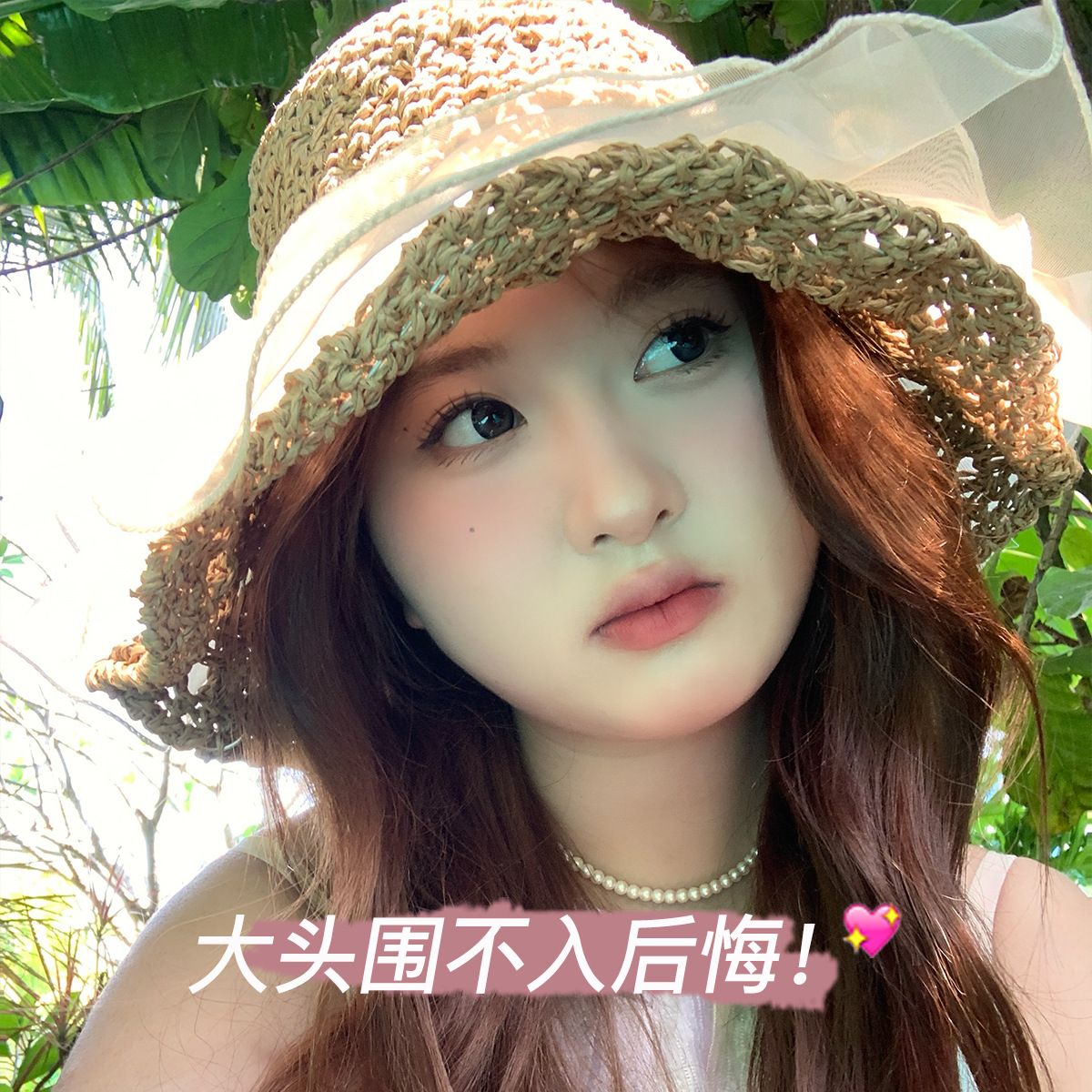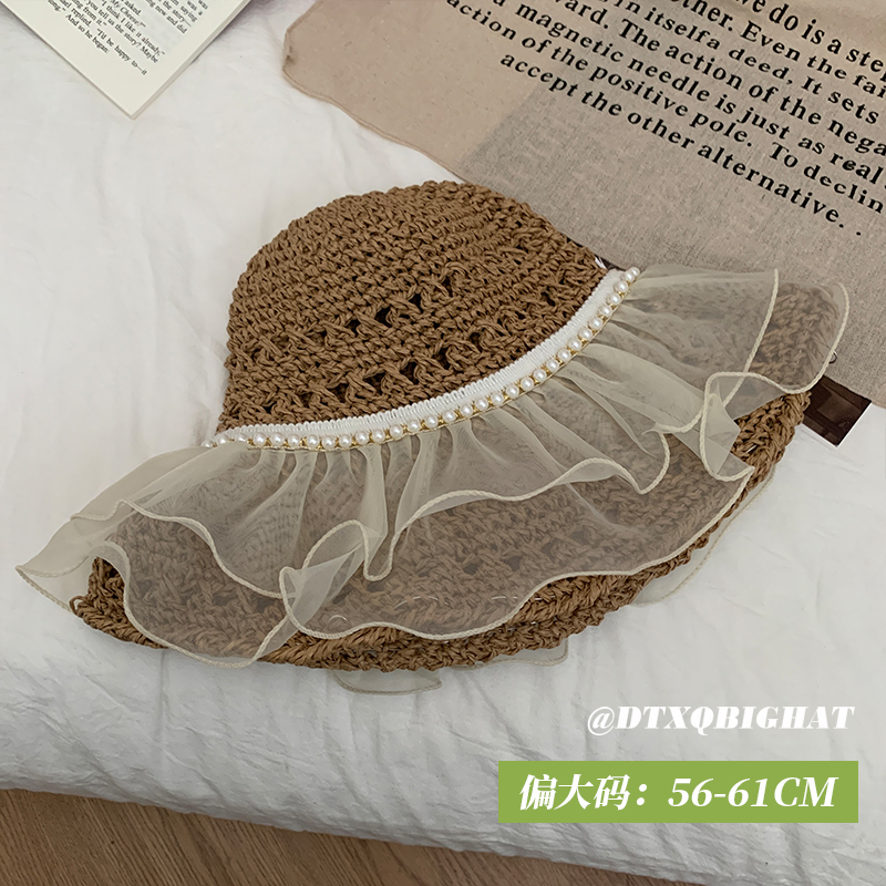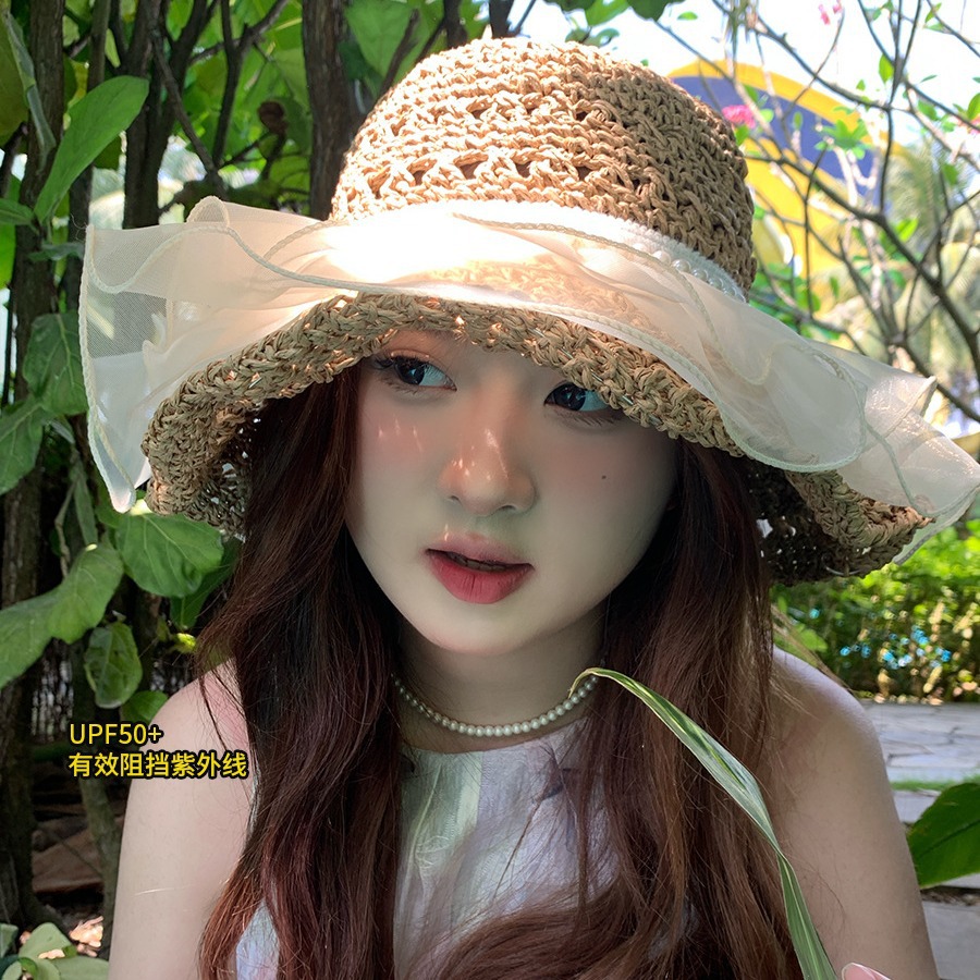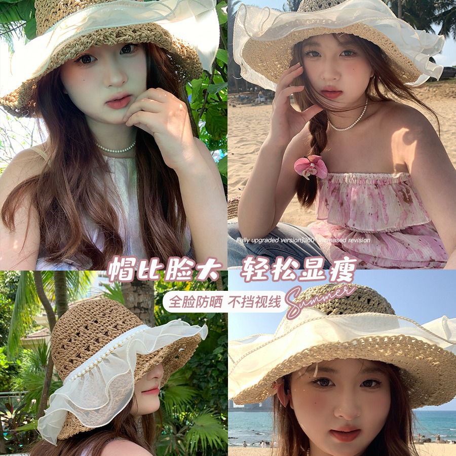 珍珠网纱镂空草编草帽女夏季大帽檐防紫外线遮阳帽子遮全脸太阳帽
