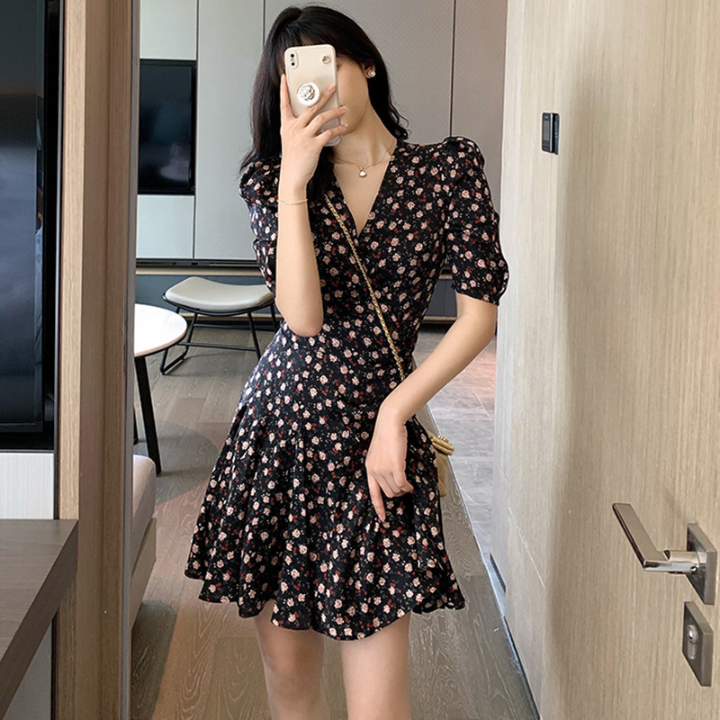 夏季新款法式温柔风短裙女气质小个子显瘦雪纺V领碎花连衣裙